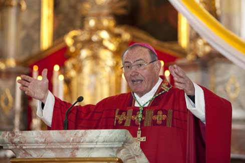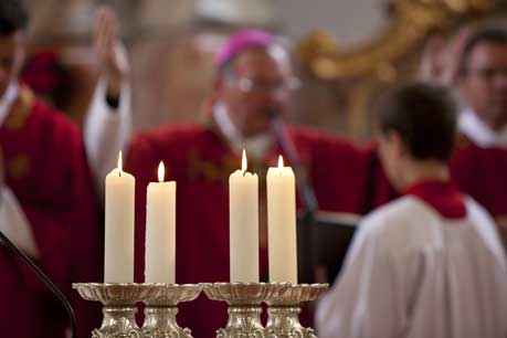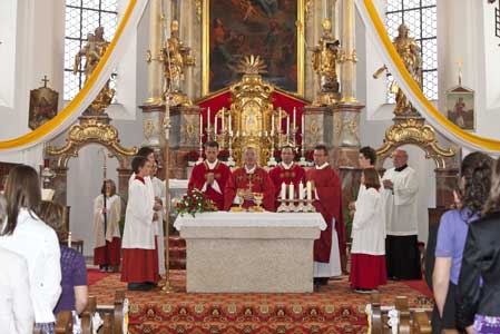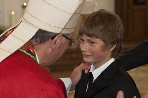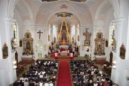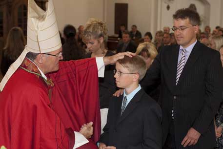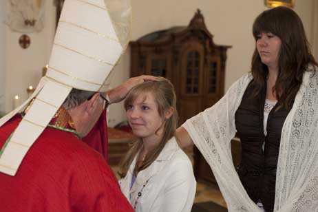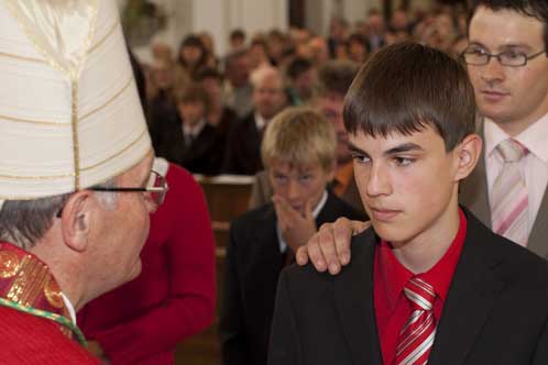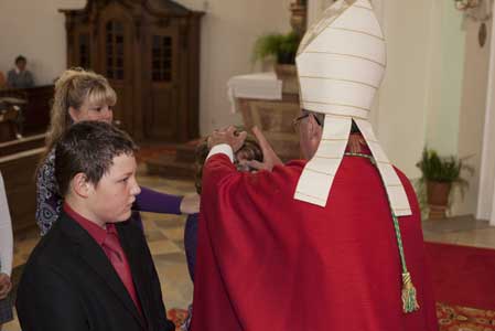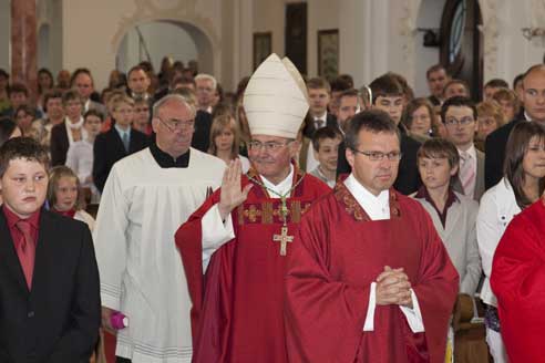 Weihbischof Bernhard Haßlberger war in den Pfarrverband Schönberg gekommen, um 75 jungen Christen das Sakrament der Firmung zu spenden.