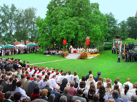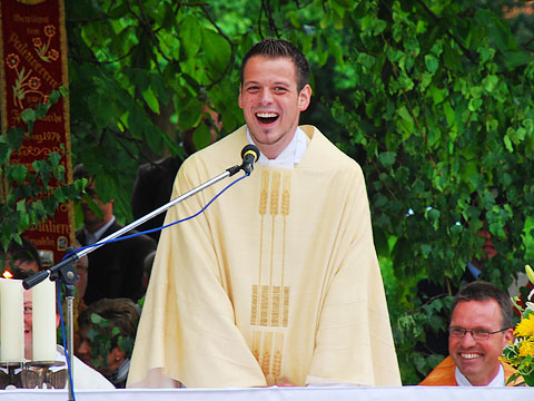 Ein langer Kirchenzug begleitete die Geistlichkeit an den Festort. Neben dem Neupriester waren dies sein "Lehrherr" Pfarrer Paul Janßen, der Redemptoristen-Pater Sebastian Redl, seine Vorgänger und Nachfolger in der Ausbildung Kaplan Peter Förster und Stefan Leitenbacher sowie Diakon Alfred und Pastoralreferentin Claudia Stadler.