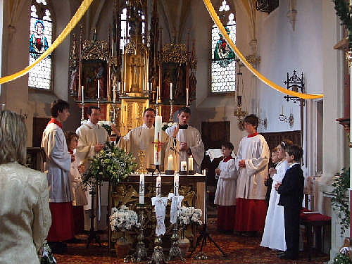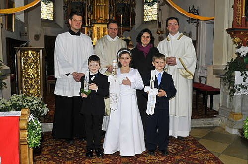 Natürlich ist es für die Pfarrgemeinde Haunzenbergersöll immer ein bedeutender Tag - die Erstkommunion. Für die drei Kinder, Simone Fußeder, Simon Neubauer und Lucas Englmaier, die zum ersten Mal den Leib und das Blut Christi empfangen durften, war dieser Tag jedoch weit mehr. Zum Einen der Abschluss und damit Höhepunkt einer langen und intensiven Vorbereitung zusammen mit den Eltern, Lehrern und Seelsorgern; zum Andern einer der festlichsten Tage im Leben, bei der alle Augen auf Einen gerichtet sind und sich viele Menschen herzlich mitfreuen, wenn Jesus sich erstmals in dieser einmaligen Art und Weise ganz persönlich schenkt. Der Kinderchor unter der Leitung von Hans Nützl umrahmte den Gottesdienst besonders festlich. Und so merkte man nicht nur Alfred Stadler bei seiner engagierten Predigt, sondern allen Zelebranten, Mitwirkenden und Mitfeiernden diese besondere Freude an, die dieser Tag ausstrahlte.