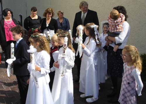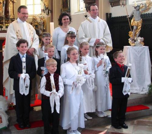 Nach langer Vorbereitung, bei der die Kinder besonders auch von ihren Müttern liebevoll begleitet und nicht nur materiell auf das große Ereignis eingestimmt wurden, empfingen sie in der voll besetzten Pfarrkirche den Leib des Herrn in Form von Hostie und Wein aus den Händen von Pfarrer Paul Janßen und Diakon Alfred Stadler.