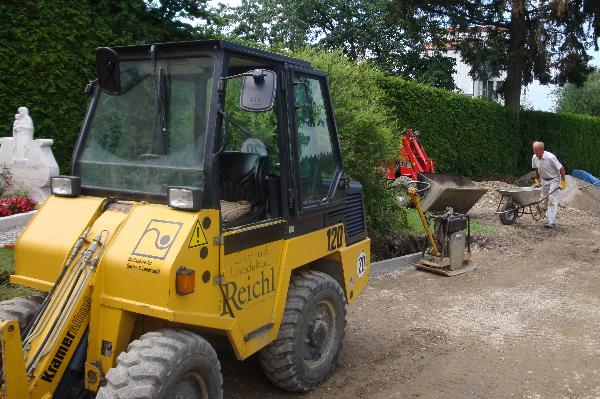 Gärtnermeister Hans Reichl stellte seine Fahrzeuge und Maschinen zur Verfügung; viele weitere Helfer, darunter auch der Bürgermeister Konrad Sedlmeier ihre Muskelkraft, um einen bequemen, mit Rollstühlen, Rollatoren oder auch Kinderwägen zu erreichenden Zugang zu bauen.