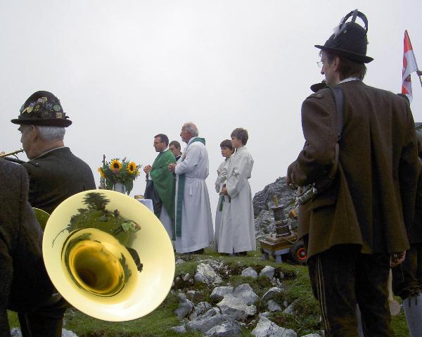 Der volle Klang der Jagdhörner, mit denen die Mitglieder der Mühldorfer Jagdhornbläser den Gottesdienst gestalteten, hallte harmonisch durch den sich leider nicht lichtenden Nebel auf dem Sudelfeldkopf.