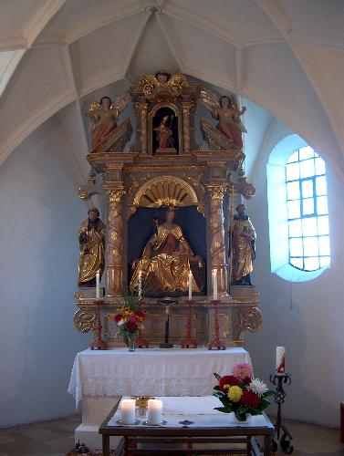 Der Hauptaltar stammt aus der 1.Hälfte des 17. Jahrhunderst und ruht auf einer gotischen Mensa. Die Kirchenpatronin Margareta thront unter einer Muschel. Das gotische Schnitzwerk, aus der Zeit um 1515, ist ein bedeutendes und hervorragendes Werk, das dem Landshuter Kunstkreis zuzurechnen ist.