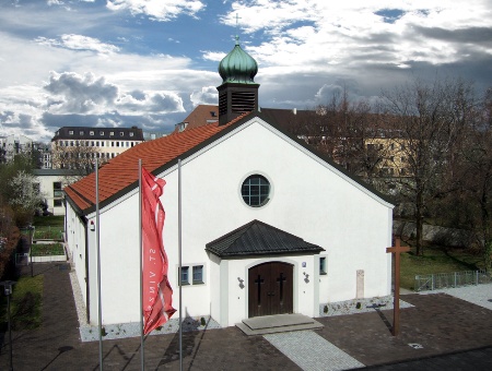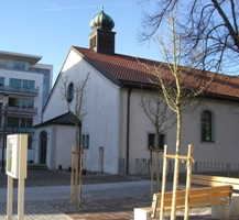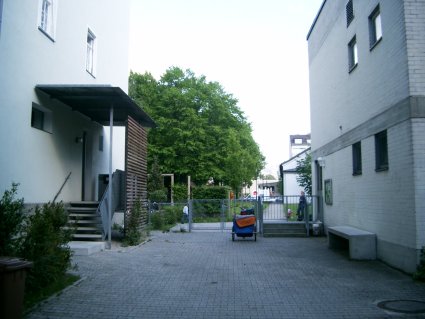 Gegenüberliegend der Eingang zum Pfarrheim in der Birkerstr. 25