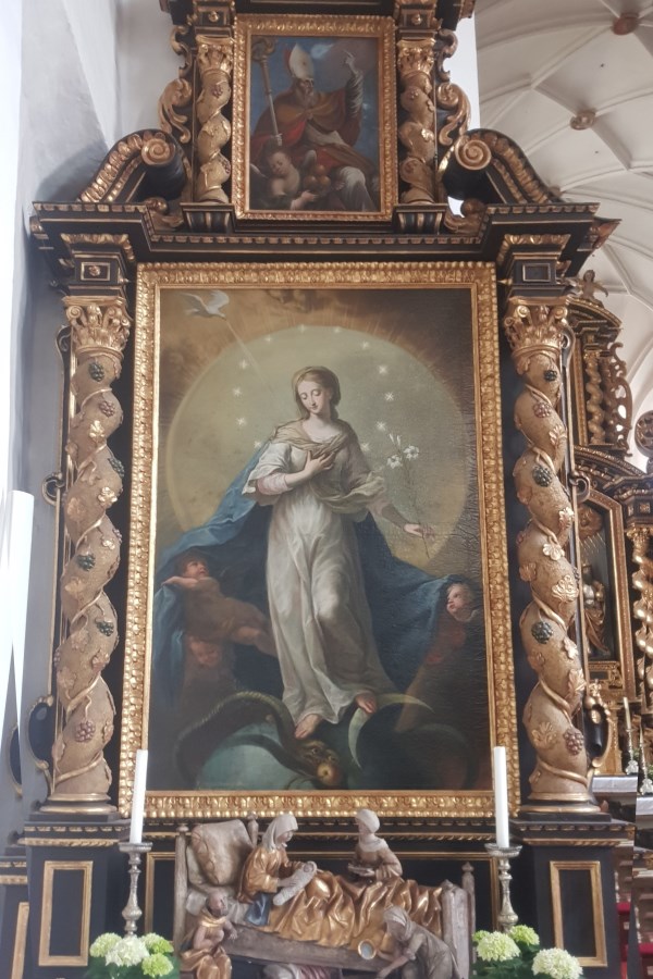 An der rechten Chorwand sind noch die Werktagsseiten des ehemaligen gotischen Hochaltares mit Darstellungen aus dem Marienleben zu sehen: Heimsuchung Mariens, Darstellung im Tempel, Geburt Jesu und Beschneidung. Besonders reizvoll auf den Seitenaltären sind die Darstellung der Geburt Mariens auf dem linken Seitenaltar. Das Holzrelief Anna Selbdritt befindet sich auf dem rechten Seitenaltar.