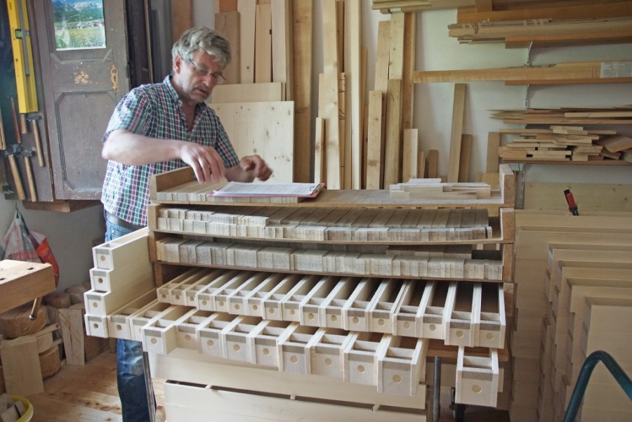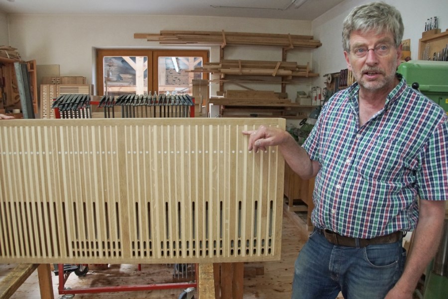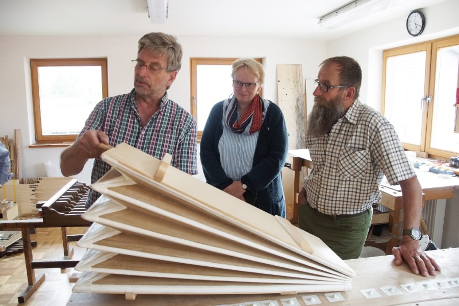 In der sehr interessanten 90-minütigen Führung durch seinen Betrieb erklärte Herr Linder anschaulich die komplizierten Schritte, die für den Bau einer neuen Orgel wichtig sind. Die Führung begann im umfangreichen Holzlager, der „Schatztruhe“ des Orgelbaus, denn die verschiedenen Holzarten müssen exakt gewachsen, schadensfrei, richtig geschnitten und viele Jahre gelagert sein, um für den Bau der Orgelpfeifen, der Windladen usw. verwendet werden zu können.