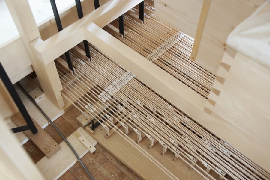In den nächsten Räumen wurden die Feinheiten beim Bau der Holzpfeifen, des Blasebalgs und der Luftsteuerung zu den Pfeifen an in Arbeit befindlichen Teilen für den nächsten Orgelneubau in Vogtareuth erläutert.