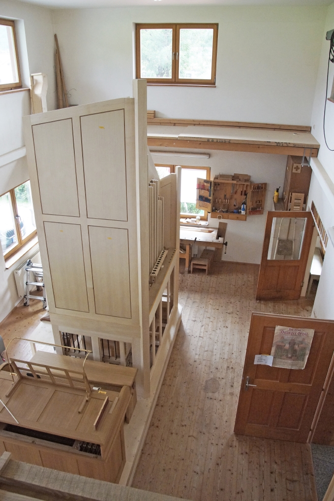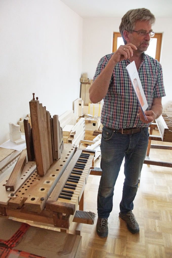 Um die Spannung hochzuhalten, führte Alois Linder die Abordnung erst im letzten Raum zur bereits aufgebauten neuen Oberteisendorfer Orgel. Beim Anblick der neuen Orgel reagierten die Teilnehmer zunächst sprachlos und dann begeistert. Aufgebaut war der zweite Teil der neuen Orgel, da aus Platzgründen der erste Teil bereits vorher stand, auf Funktionalität geprüft und wieder in die Einzelteile zerlegt wurde. Zu sehen war der Spieltisch mit dem mächtigen Gehäuse des Orgelwerks mit den Verbindungsteilen zu den insgesamt 1.038 Orgelpfeifen und dem Motor für den Blasebalg.