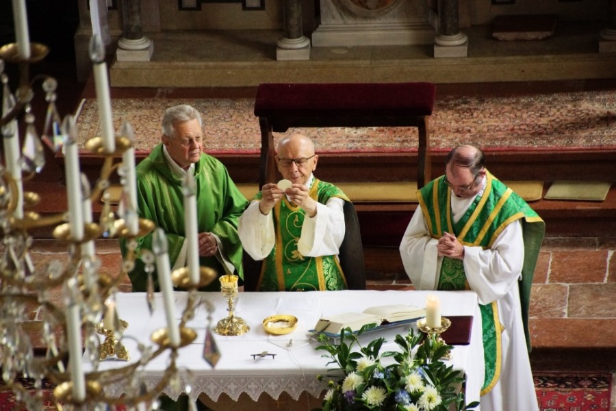 Als wir Richtung Reit im Winkel kamen, verzogen sich die düsteren Wolken und der blaue Himmel samt Sonnenschein kam hervor. Bald war allen klar, dass es in diesem Jahr wohl Richtung Tirol ging. So war es dann auch. Der Bus hielt vor der Pfarrkirche in Kössen. Dort sollten wir also die Messe gestalten. Zunächst einmal war aber in dieser wunderschönen, hellen Barock-Kirche das Einsingen angesagt. Durch volle Konzentration aller Beteiligten sind die Lieder gut gelungen. Die hervorragende Akustik tat natürlich ein Übriges dazu. Ein kleiner Schwächeanfall einer unserer Sängerdamen war am Ende des Gottesdienstes auch wieder überwunden, schließlich wurde sie von allen Seiten liebevoll umsorgt.