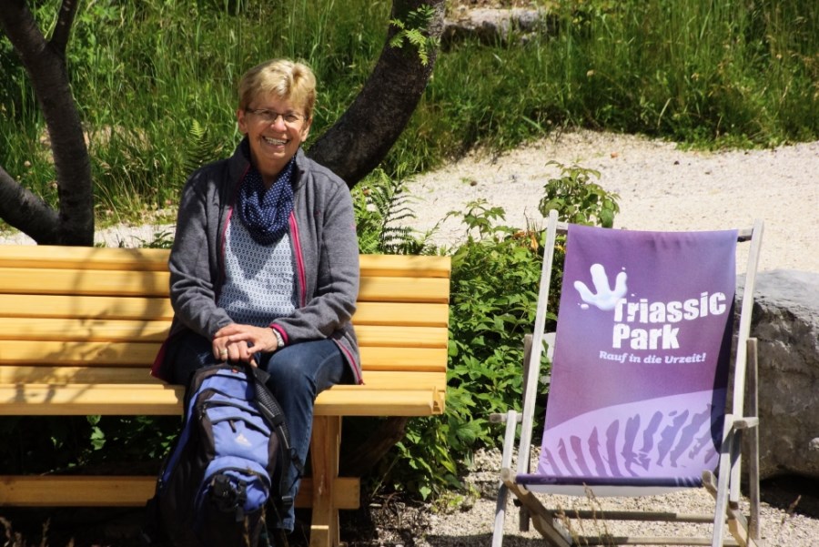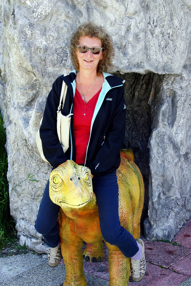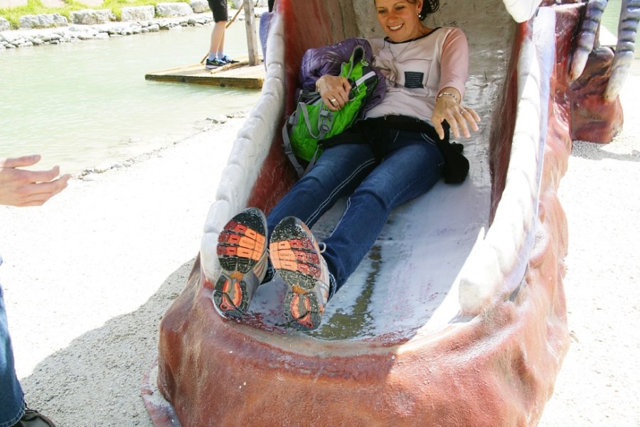 Gut gestärkt und bei aufkommenden Sonnenschein gingen wir den Abenteuerpfad durch den Triassik-Park. An zahlreichen Schautafeln und Erlebnis-Stationen wird man hier durch die urzeitliche Entwicklung der Tierwelt herangeführt. Am oberen Ausgang angekommen, durchquerten wir den „urzeitlichen“ Erlebnispark. Natürlich werden die Erwachsenen dann auch wieder zu Kindern. Es dauerte nicht lange, bis Rutschen, Steine auf dem Wasser und eine Floßfahrt auf „wildem“ Gewässer die Herzen höher schlagen ließ.