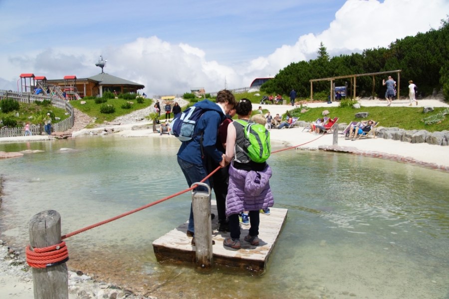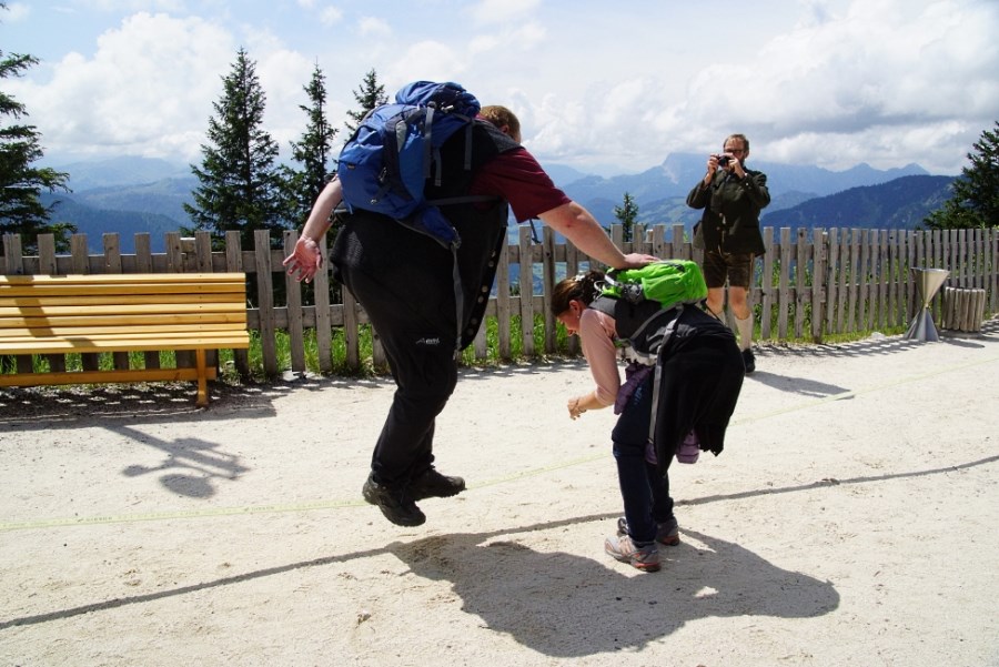 Zum Abschluss genossen wir auf dem Vergnügungsareal noch die Liegestühle oder nutzten nochmals die Gelegenheit auf dem Floß herumzuturnen. Der Anderl hat sich noch schnell ein Eis gegönnt und schon mussten wir gegen 15 Uhr wieder zur Seilbahn, um uns von der schönen tiroler Bergwelt zu verabschieden. Am Tal angekommen, hat sich der Bernhard bereits den Luxus einer Zigarillo geleistet, während ich am Sportgeschäft nebenan noch erkunden wollte, ob es dort auch eine „Happy Hour“ gibt, was natürlich verneint wurde.