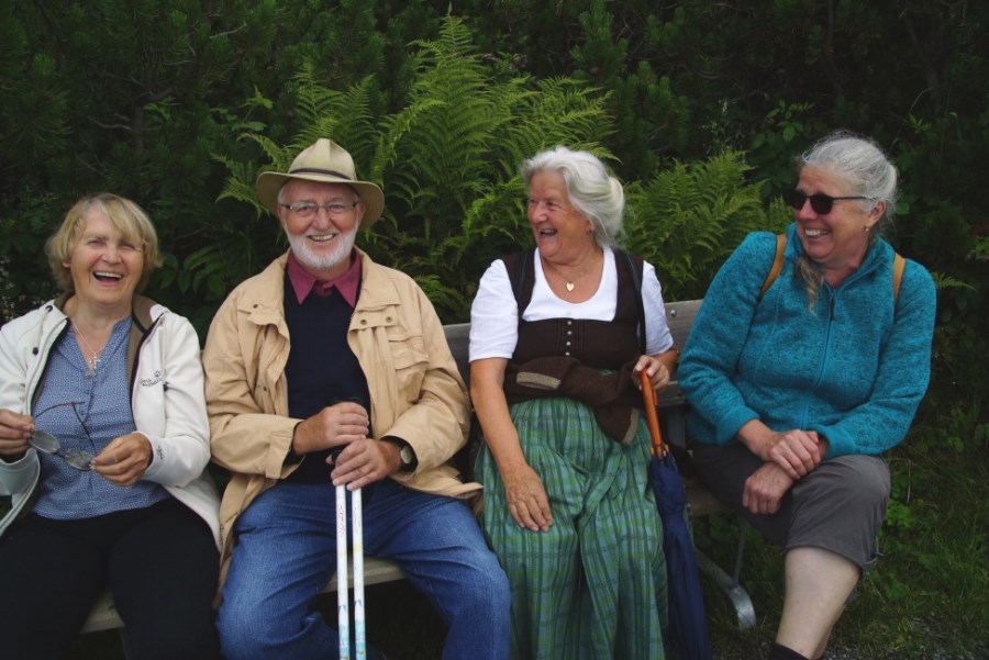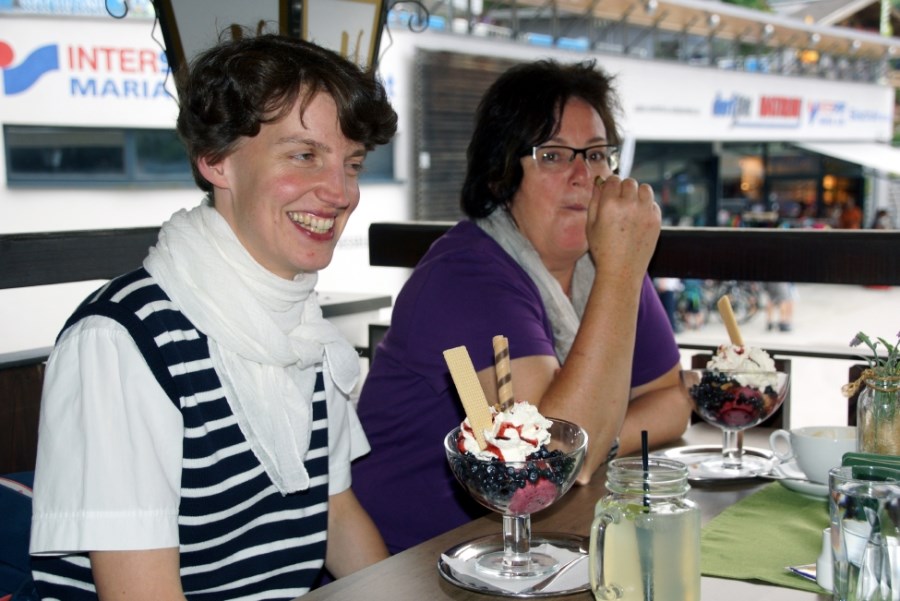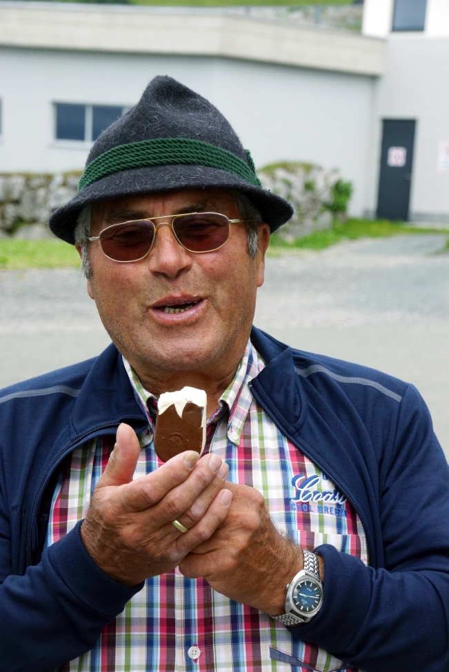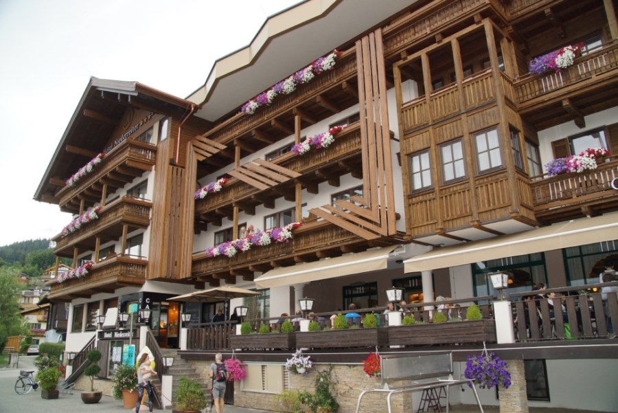 So jetzt waren alle schon gespannt, wo es zum nachmittäglichen Kaffee hingehen sollte. Der Busfahrer erzählte was von St. Ulrich am Pillersee, was wir zunächst auch glaubten, da wir tatsächlich an diesem wunderschönen türkisblauen Kleinod vorbei fuhren. Doch gehalten haben wir nirgends. Als wir dann auch noch Fieberbrunn hinter uns ließen, dachten einige schon an die Einkehr an einer Tankstelle in Saalfelden mit einem Café to go. So kam es Gott-sei-dank nicht, wobei wir an Leogang vorbei tatsächlich nach Saalfelden fuhren. Aber auch diesen Hauptort des Pinzgaus haben wir nur durchquert und fuhren geradewegs Richtung Hochkönig. Der Busfahrer hat uns dabei noch ausführlich die Geschichte der Einsiedelei oberhalb der Stadt Saalfelden erläutert. Mittlerweile waren wir in Maria Alm angelangt. An einem sehr großen Hotel mit angegliederten Café konnten wir bei angenehm warmen Temperaturen auf der Terrasse sitzen und Kaffee, Kuchen oder Eisspezialitäten genießen.