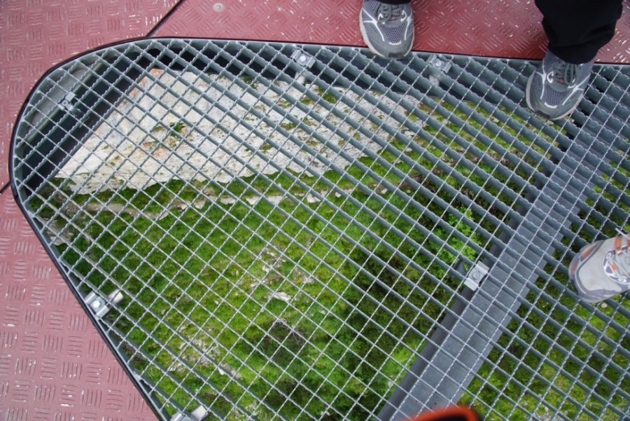 Dann ging es einen leichten Hang hinauf, bis wir am Fuß der eigentlichen Steinplattenfelswand standen. Hier wartete eine besonders waghalsige Station auf uns, nämlich der Skywalk. Hier bewegt man sich direkt über dem Abgrund. Nur Glasplatten oder Gitterroste trennten uns vor dem Fall in die Tiefe. Es ist schon ein mulmiges Gefühl, überhaupt bei „gewichtigeren“ Personen wie meiner einer. „Wer weiß, wird die Glasplatte halten, oder war‘s das???“