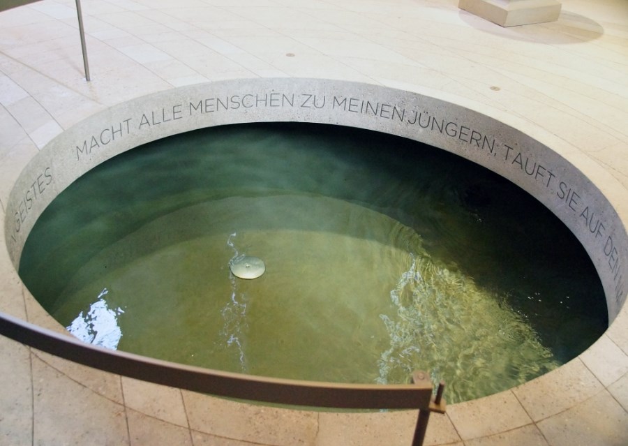 Zuerst besuchten wir die neu renovierte St. Petri-Kirche. Dort wurde Luther bereits einen Tag nach seiner Geburt, also am 11.11.1483, getauft und erhielt sogleich den Namen des Tagesheiligen - Martin. Der Originaltaufstein überlebte die Jahrhunderte nur schwer beschädigt im Vorgarten des Anwesens, wurde im Zuge der Generalsanierung aber in Bruchstücken unter die Neufassung des Taufsteines eingearbeitet. Besonders sehenswert ist das große Taufbecken, in dem auch Ganzkörpertaufen möglich sind. Das durchfließende Wasser soll den Fluß Jordan symbolisieren, als Fluß der Umkehr und der Taufe Jesu.