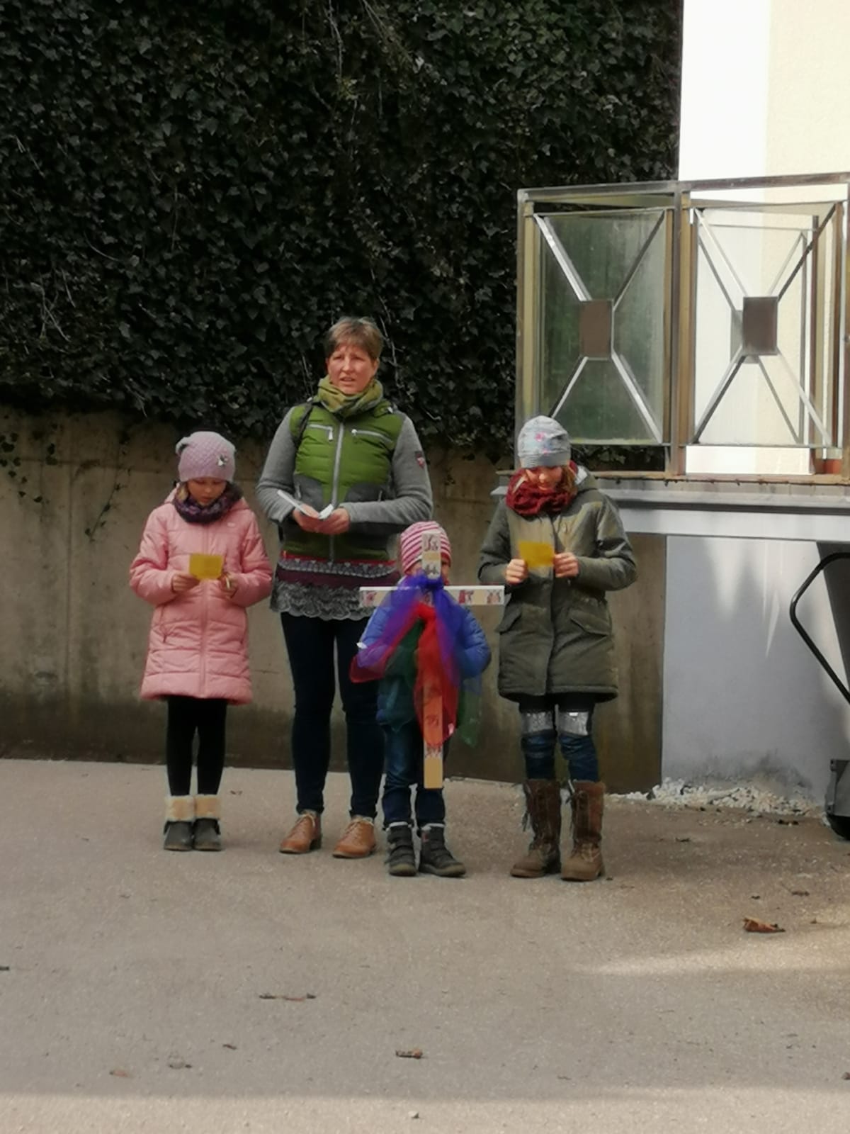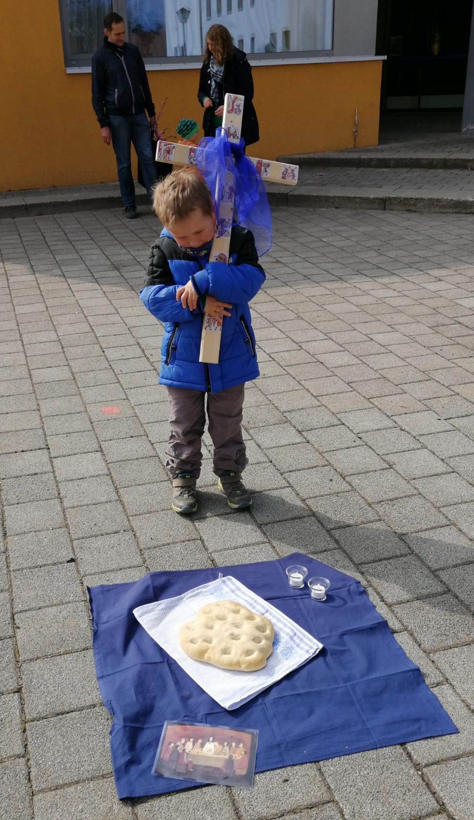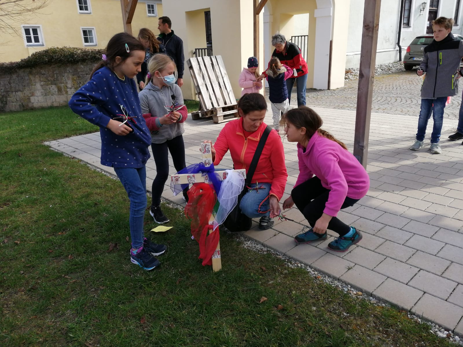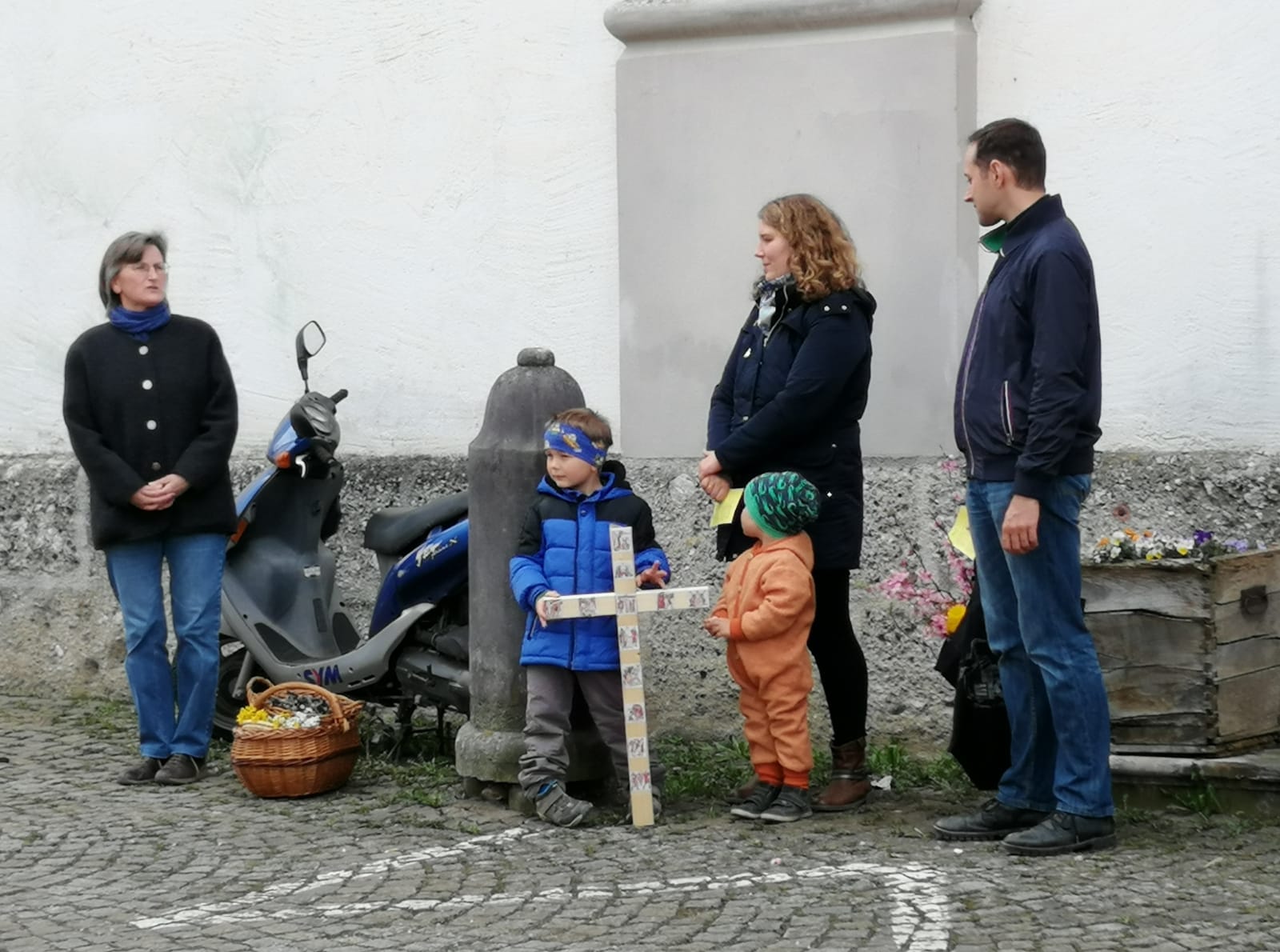 45 Kinder gingen mit ihren Eltern die 7 Stationen. Zu Beginn vor der Klosterkirche, begrüßte Monika Lechner-Huber im Namen des Familienkirche-Teams alle und führte in die Geschichte des Kreuzweg ein. Alle sprachen den Text des traditionellen Beginn-Liedes „Gottes Liebe ist so wunderbar“ mit Bewegungen. Auch erhielt jedes Kind ein kleines Kreuz aus Ästen. Je ein Kind führte den Kreuzweg mit dem Vortragekreuz von Station zu Station an. Dort wurde ein großer Kreis gebildet und das Weg-Lied gemeinsam gesprochen von Fußstampfen begleitet. In der Mitte baute das Team in mehreren Schritten jeweils ein Legebild mit farbigem Ketttuch, Symbol, Kreuzweg-Bild und 2 Teelichtern, die die Fürbitten begleiteten, auf. Die Familien lauschten den erzählten biblischen Ereignissen, hielten kurz Stille und beteten. Dieser Ablauf wiederholte sich an den weiteren Stationen: Schule, Platz vor Bibliothek, Altersheim, Mariensäule am Stiftskirchenplatz, vor dem Pfarrheim und im Pfarrgarten. An jeder Station wurde passend zu dieser symbolischen Farbe der gestalteten Mitte um das Vortragekreuz ein Chiffontuch umgeschlungen und die Kinder bekamen für ihre kleinen Kreuze dieselben farbigen Bänder. So wurde der Leidensweg Jesu bunt. Im Pfarrgarten legten die Kinder ihre mit gebrachten Blütenzweige und Blumen auf das Kreuz: Aufblühen, Frühling, Wachstum durch die mitgebrachte leuchtende Blumen-Gabe deckten das Leid zu. Nach der Segensbitte lud die Gemeindereferentin, Ursula Kirchhofer, noch im Namen von Pfarrer Gumpinger ein, jede Familie einzeln mit Abstand die Hl. Grab Kapelle zu besuchen. Dort traf dann auch später in seinem Garten Pfarrer Gumpinger, nach der Karfreitagsliturgie, mit Diakon Uwe Kraus, ein und sie verabschiedeten die Familien.