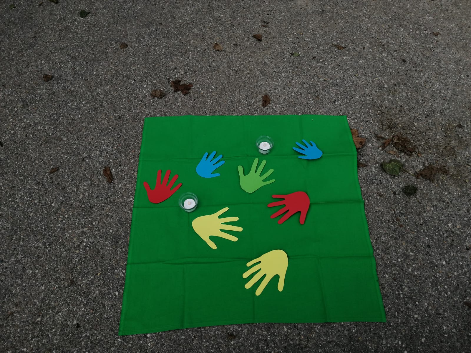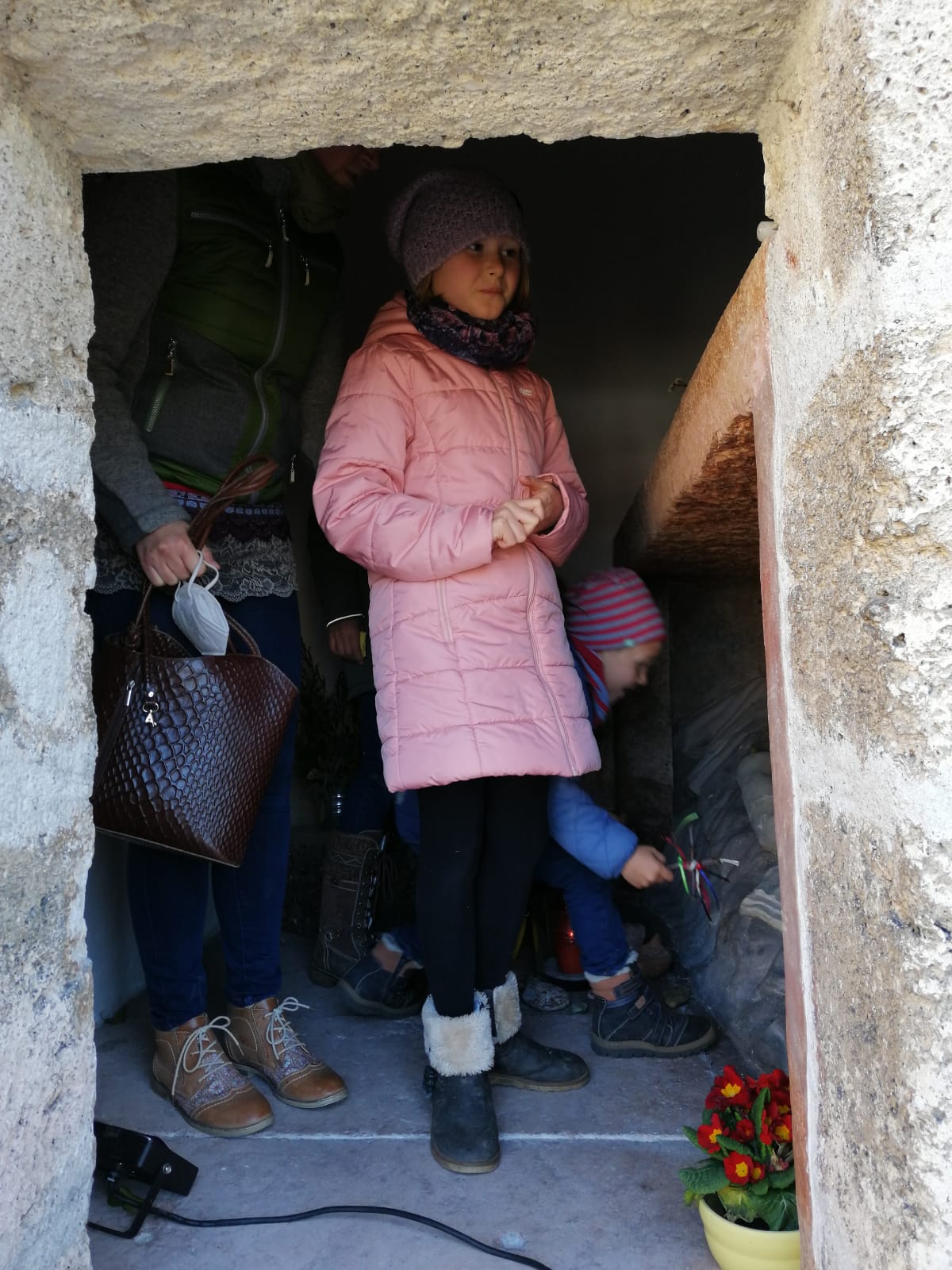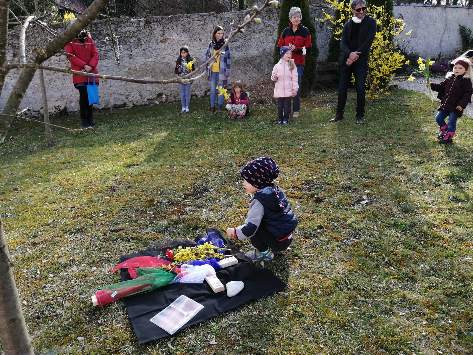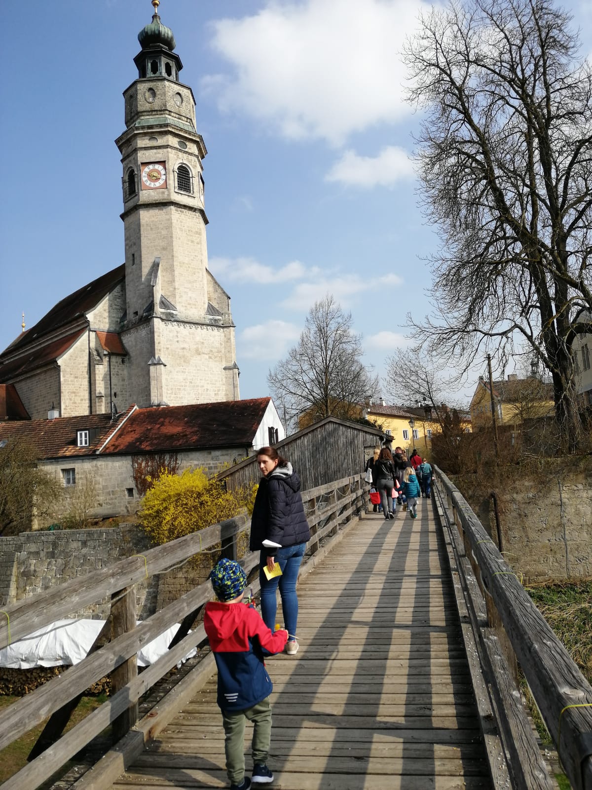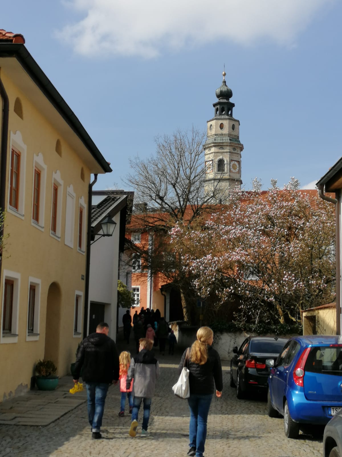 45 Kinder gingen mit ihren Eltern die 7 Stationen. Zu Beginn vor der Klosterkirche, begrüßte Monika Lechner-Huber im Namen des Familienkirche-Teams alle und führte in die Geschichte des Kreuzweg ein. Alle sprachen den Text des traditionellen Beginn-Liedes „Gottes Liebe ist so wunderbar“ mit Bewegungen. Auch erhielt jedes Kind ein kleines Kreuz aus Ästen. Je ein Kind führte den Kreuzweg mit dem Vortragekreuz von Station zu Station an. Dort wurde ein großer Kreis gebildet und das Weg-Lied gemeinsam gesprochen von Fußstampfen begleitet. In der Mitte baute das Team in mehreren Schritten jeweils ein Legebild mit farbigem Ketttuch, Symbol, Kreuzweg-Bild und 2 Teelichtern, die die Fürbitten begleiteten, auf. Die Familien lauschten den erzählten biblischen Ereignissen, hielten kurz Stille und beteten. Dieser Ablauf wiederholte sich an den weiteren Stationen: Schule, Platz vor Bibliothek, Altersheim, Mariensäule am Stiftskirchenplatz, vor dem Pfarrheim und im Pfarrgarten. An jeder Station wurde passend zu dieser symbolischen Farbe der gestalteten Mitte um das Vortragekreuz ein Chiffontuch umgeschlungen und die Kinder bekamen für ihre kleinen Kreuze dieselben farbigen Bänder. So wurde der Leidensweg Jesu bunt. Im Pfarrgarten legten die Kinder ihre mit gebrachten Blütenzweige und Blumen auf das Kreuz: Aufblühen, Frühling, Wachstum durch die mitgebrachte leuchtende Blumen-Gabe deckten das Leid zu. Nach der Segensbitte lud die Gemeindereferentin, Ursula Kirchhofer, noch im Namen von Pfarrer Gumpinger ein, jede Familie einzeln mit Abstand die Hl. Grab Kapelle zu besuchen. Dort traf dann auch später in seinem Garten Pfarrer Gumpinger, nach der Karfreitagsliturgie, mit Diakon Uwe Kraus, ein und sie verabschiedeten die Familien.