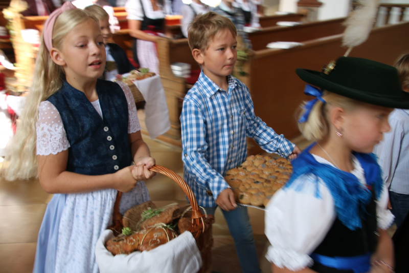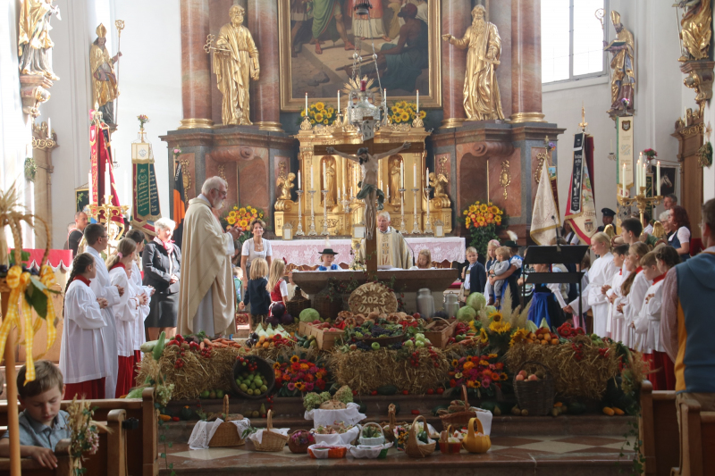 Am Sonntag riefen die Glocken der Pfarr- und Stiftskirche zum gemeinsamen Dankgottesdienst. Für die Kinder fand eine kindgerechte Andacht am Kirchplatz statt und in der Kirche zelebrierte Stiftsdekan Gerhard Gumpinger die Festmesse. Zur Gabenbereitung zogen die Kinder mit Ihren Familien in die Kirche ein und hatten die am Vortag gebackenen Brote mit dabei und legten diese vor den Erntedankaltar zu Segnung nieder.