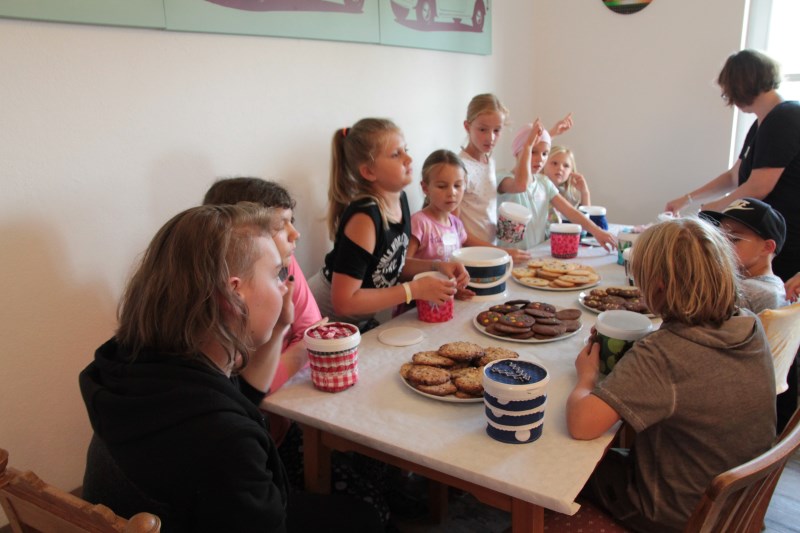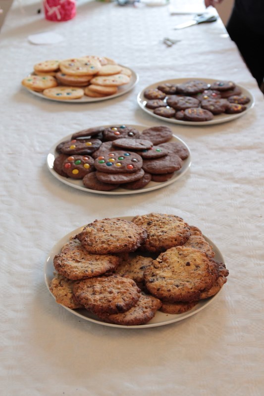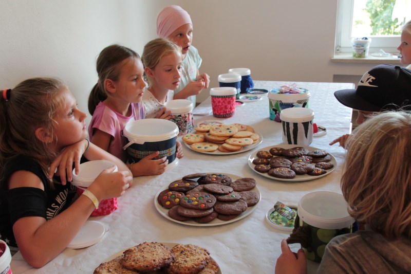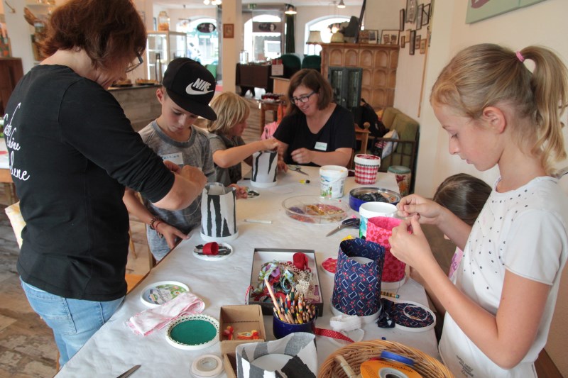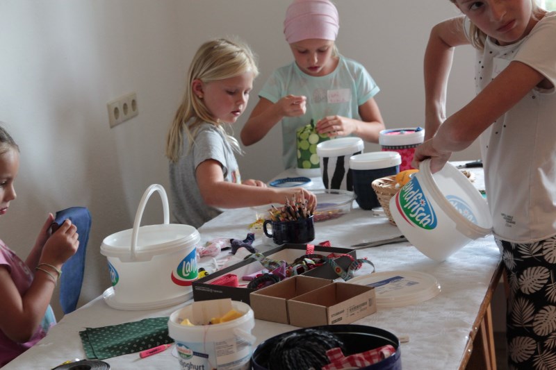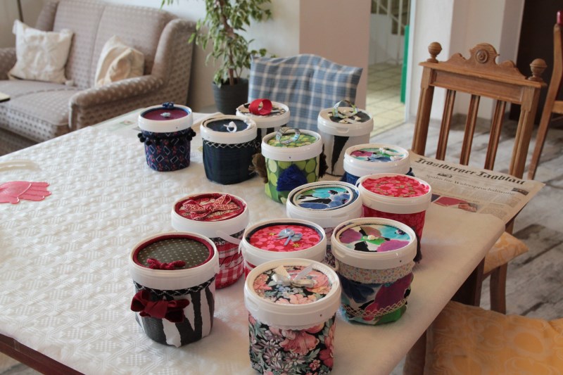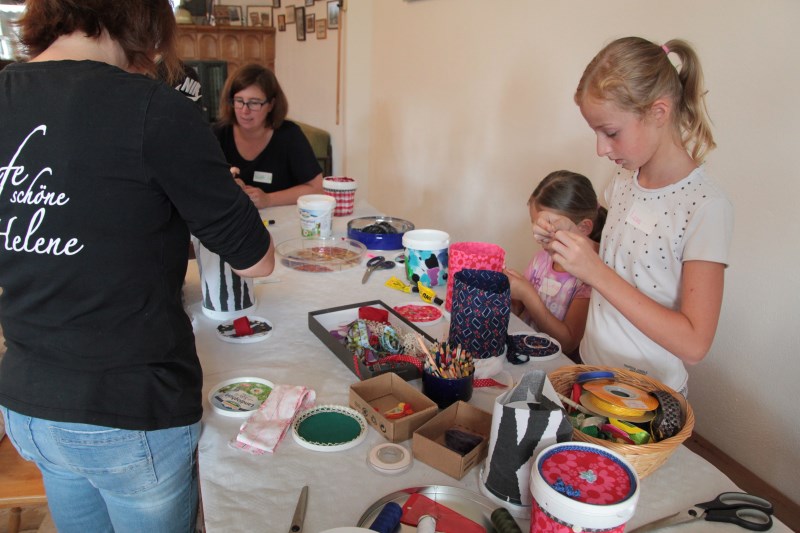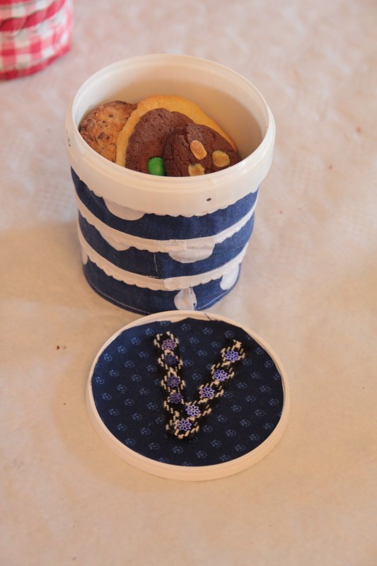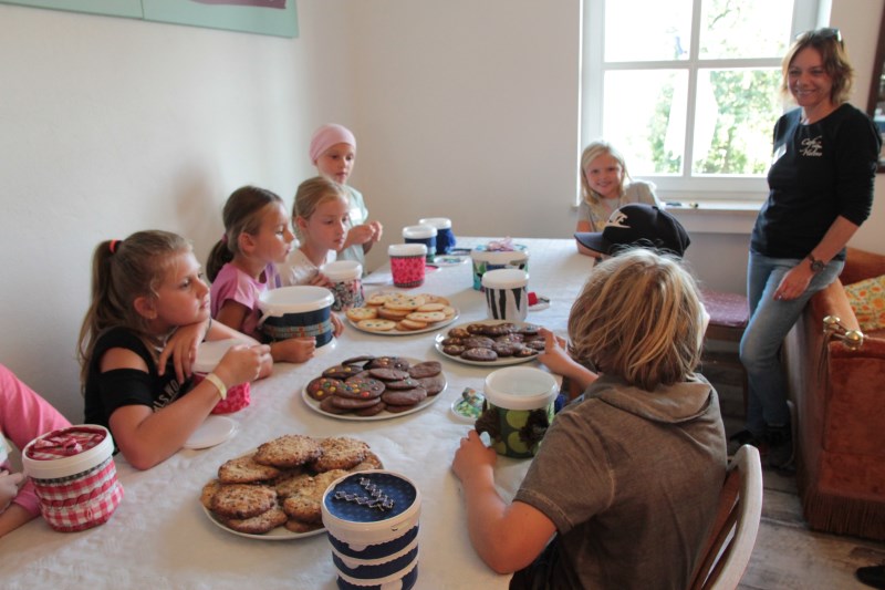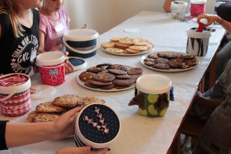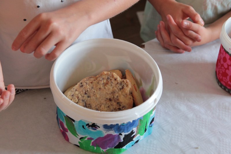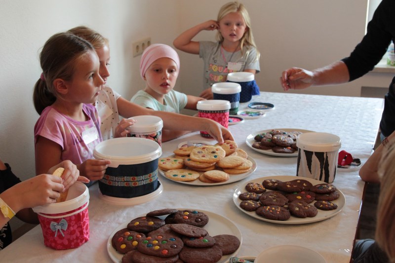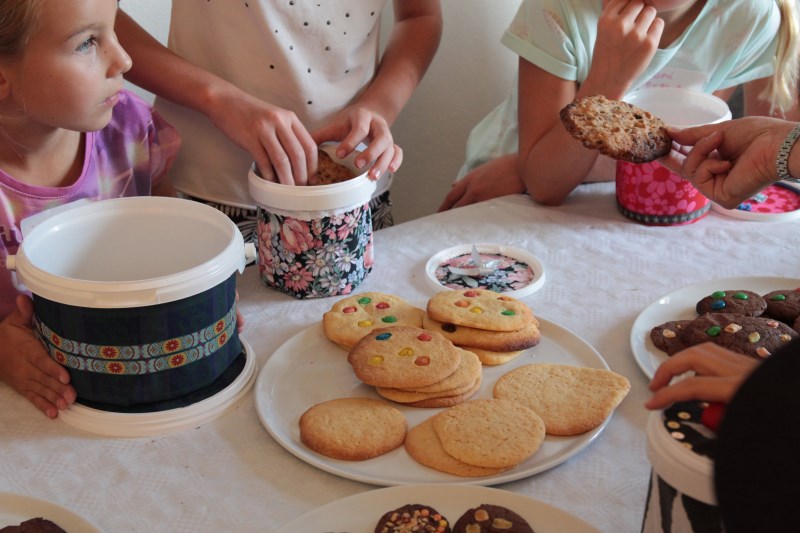 Zusammen mit Claudia und Waltraud backt ihr verschiedene Cookies. Damit ihr diese dann mit nach Hause nehmen könnt, wird eine Keksdose gebastelt. Diese entsteht aus kleinen Joghurtbechern beklebt mit Textilien. Dies ist auch ein schönes Mitbringsel für eine Party oder zum Picknick.