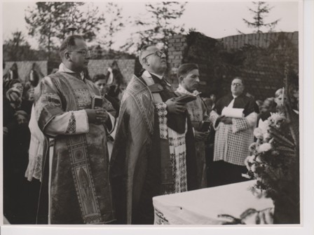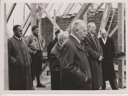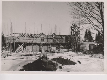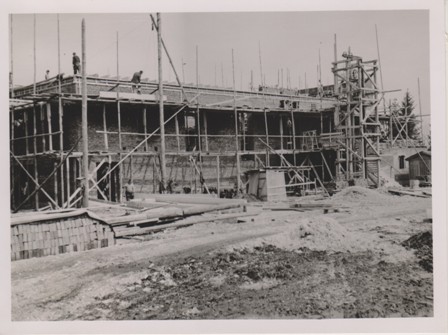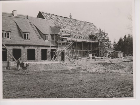Architekt des Ensembles wird Professor Joseph Wiedemann, der auch gleichzeitig die Siedlung "Am Anger" plante. Der 1. Spatenstich fand am 1.10.1950 statt.Welche schwierigen äußeren Bedingungen damals zu überwinden waren zeigt u.A. ein Bauvertrag vom 15.08.1949 zwischen Stadtpfarrer Johann Wagner und Michael Reininger / Schwarzau, der die "Gemeinschaftsarbeit zur Herstellung der Hohlblocksteine für den Kindergarten" regelte:"... Als Gegenwert erhält Herr Reininger keine Barleistung, sondern eine entsprechende Menge ungelöschten Siebkalkes, dessen Berechnungswert DM 2,50 für 50 kg beträgt".