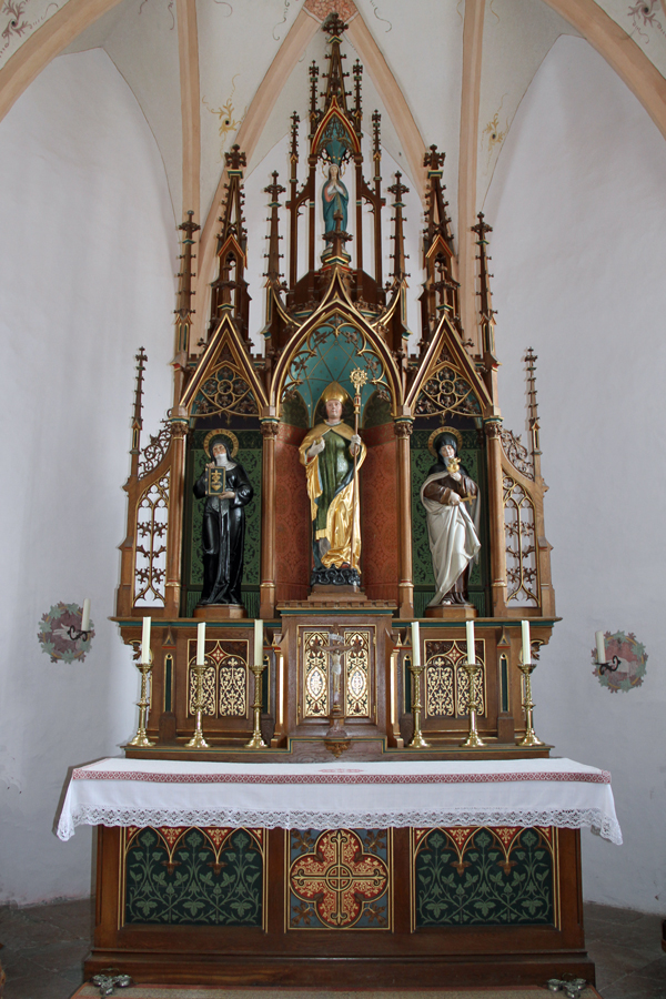 Um etwa 1885 ist der eigens für Tinning erbaute, neugotische Altar aufgestellt worden, der sich sehr harmonisch in den Innenraum einfügt. Auffallend ist, dass es sich hierbei nicht um einen Flügelaltar handelt, sondern um einen Altar mit festem Altaraufsatz. Die drei Hauptfiguren des Altares stehen in 3 Nischen. In der Mitte, über dem Tabernakel steht der Hl. Nikolaus. Diese, in den letzten Jahren des 15. Jahrhunderts entstandene Plastik, stellt die bedeutendste Figur der Kirche dar. Die dazugehörige Partnerfigur, die hl. Maria, ist in der Kirche in Feldkirchen am nördlichen Chorbogen aufgestellt. Zu beiden Seiten der Nikolausfigur stehen unbedeutende Darstellungen der beiden Mystikerinnen Teresa von Avila und Margareta Maria Alacoque.  Auf der Südseite befindet sich eine aus Feldkirchen hierher gebrachte Marienfigur im Nazarenerstil mit einer prunkvollen Brokatmanteleinfassung.