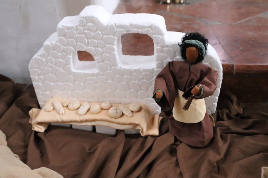 Jesus nimmt ein Brot und dankt Gott dafür. Er bricht es in Stücke und teilt es aus.