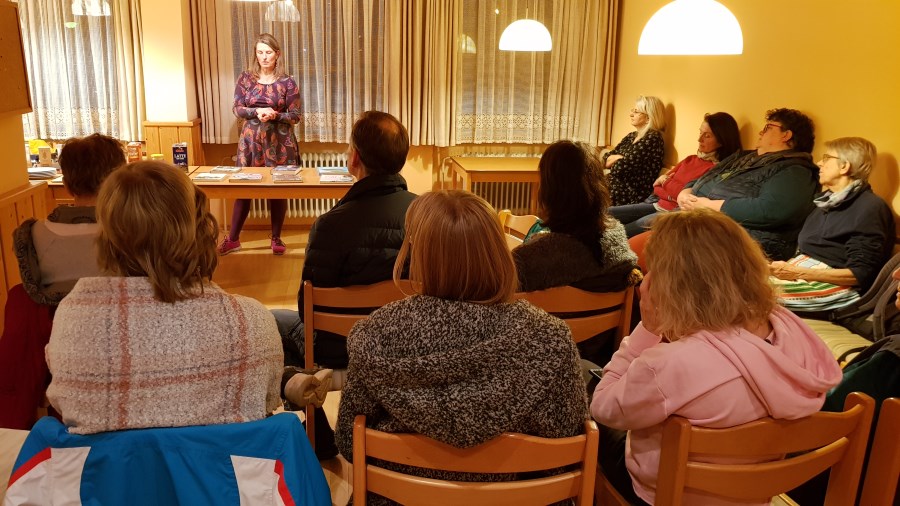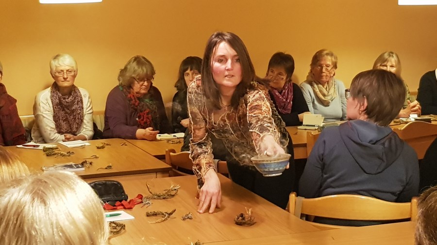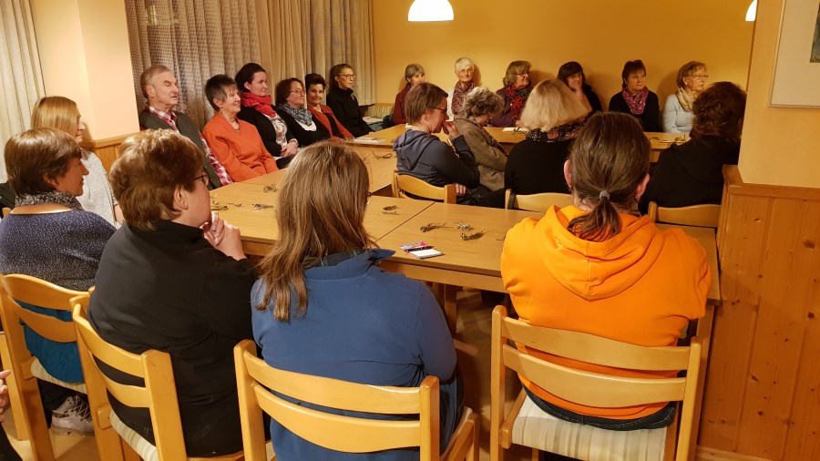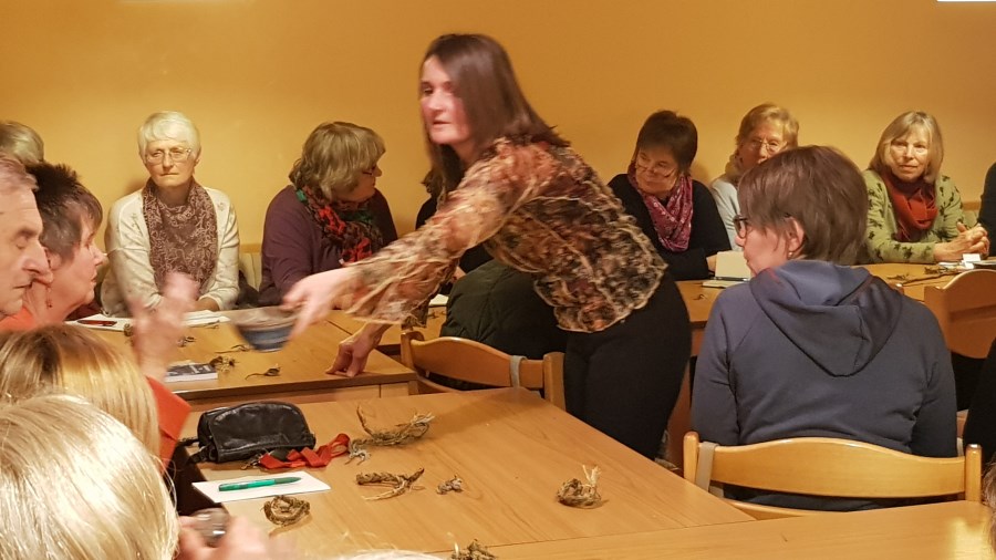 Zum Thema "Räuchern" hat der KDFB Trostberg einen Vortrag mit Martina Ziereis organisiert. Fr. Ziereis freute sich über das große Interesse an diesem Thema und führte ins Thema mit den verschiedenen Räucherarten, die dafür zu benutzenden Gefäße und Kräuter und Harze ein. Sie stellte dabei klar fest, dass man nur das räuchern soll, was man kennt und jeder selber für sich entscheiden muss, was gut riecht. Auch wies sie darauf hin, dass giftige Kräuter aus ihrer Sicht nicht zum räuchern geeignet sind. Gut auszuprobieren ist dies im Freien. Das Räuchern von Räumen stellt ein wichtiger Bereich dar und bei selber zusammengestellte Mischung sollte jeder Bestandteil zuerst einzeln getestet werden. Das Räuchern von Räumen soll Altes vertreiben und für Neues Platz machen. Auch der Garten kann für das neue Pflanzjahr geräuchert werden um eine gute Ernte zu erzielen. Die Wirkung kann mit einem Gebet z.B. "Vater unser" verstärkt werden. Auch hat jedes Kraut und Harz seine bestimmte Wirkungsweise wie z.B. Entspannung, segnend, schlechte Gefühle vertreiben, los lassen, gelassen werden, Konzentration fördern, Atemwege frei machen, Magen, Darm, für guten Rat und noch vieles mehr. In der Runde wurden dann auch gleich die verschiedensten Kräuter geräuchert und jeder konnte für sich riechen, was gut ist. Sie ging speziell auf Kräuter ein, die bei uns wachsen wie Mariengruss, Salbei, Eisenkraut, Königskerze, Johanniskraut, Holundermark, Weidenrinde, Engelwurz, Fichtenharz, lavendel, Rosmarin, Rosenblätter, Pfefferminze, Ringelblume usw. ein, stellte aber auch Räucherwerk vor, dass man in der Apotheke erwerben kann wie Drachenblut, Basilikum. Die Besucher bekamen auch noch einen kurzen Überblick über die Literatur, die Fr. Ziereis gerne zu rate zieht. Am Ende war noch genügend Zeit um sich auszutauschen und über Themen zu sprechen, die einem am Herzen lagen.