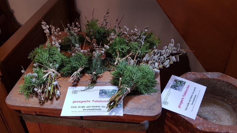 Trotz Corona wurde von den Frauen des KDFB Trostberg Palmbuschen gebunden, die dann von Pfarrer Schomers speziel bei einer Segensandacht gesegnet.
