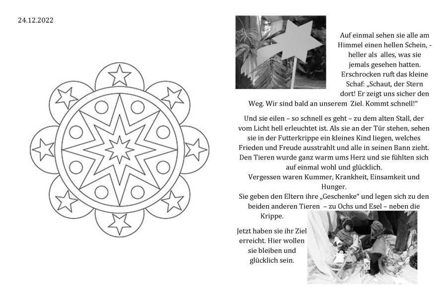 Und sie eilen – so schnell es geht – zu dem alten Stall, der vom Licht hell erleuchtet ist. Als sie an der Tür stehen, sehen sie in der Futterkrippe ein kleines Kind liegen, welches Frieden und Freude ausstrahlt und alle in seinen Bann zieht. Den Tieren wurde ganz warm ums Herz und sie fühlten sich auf einmal wohl und glücklich.