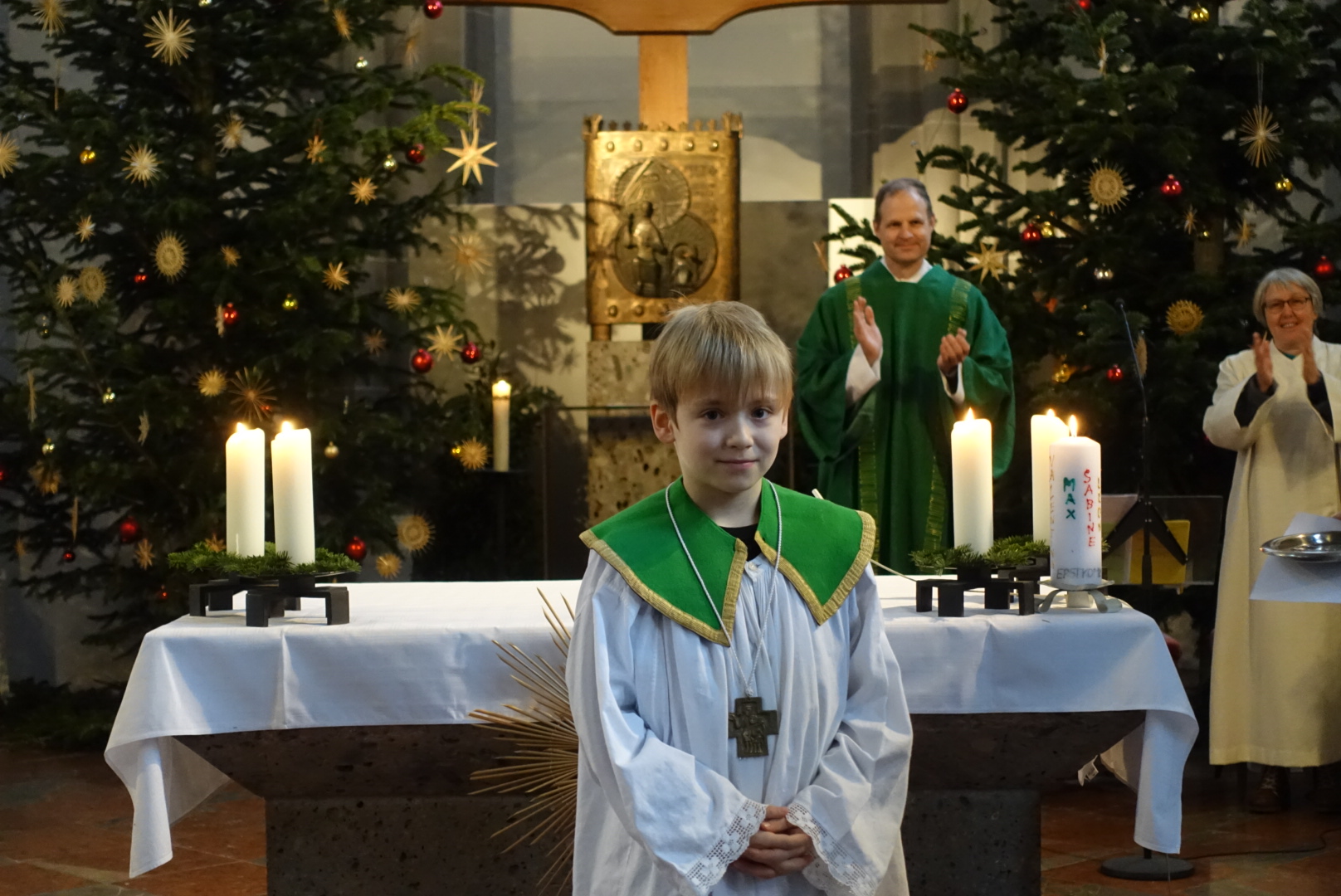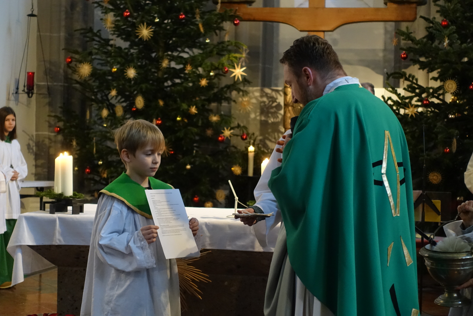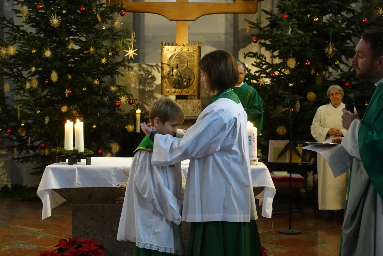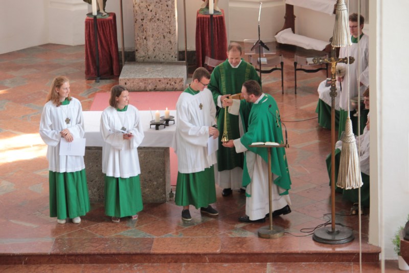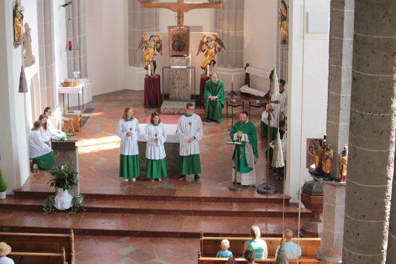 In der Pfarrei St. Andreas hat sich Luisa Jäger (9 Jahre) als einzige der diesjährigen Erstkommunionkinder entschlossen als Ministrantin tätig zu sein. Insgesamt sind 25 Ministranten in der Pfarrei bei den Gottesdiensten durchs Jahr tätig. „Mir gefällt die Arbeit, vor allem weil ich dem Pfarrer während der Messe helfen kann.“ sagt die Neunjährige. Wie das geht mit dem ministrieren, dass zeigt ihr nicht nur ihr Bruder, sondern auch Oberministrant Stefan Herth. Wieviele Kelche bei Festtagen nötig sind, wann man Wein und Wasser in den Kelch gießt, wann man die Glocken bei der Eucharistiefeier schwingt und wann welcher Unterrock dass lernt sie jetzt nach und nach. Pfarrer Dr. Florian Schomers segnete das Kreuz, dass sie künftig als Ministrantin tragen wird und Stefan Herth legte es ihr feierlich um.