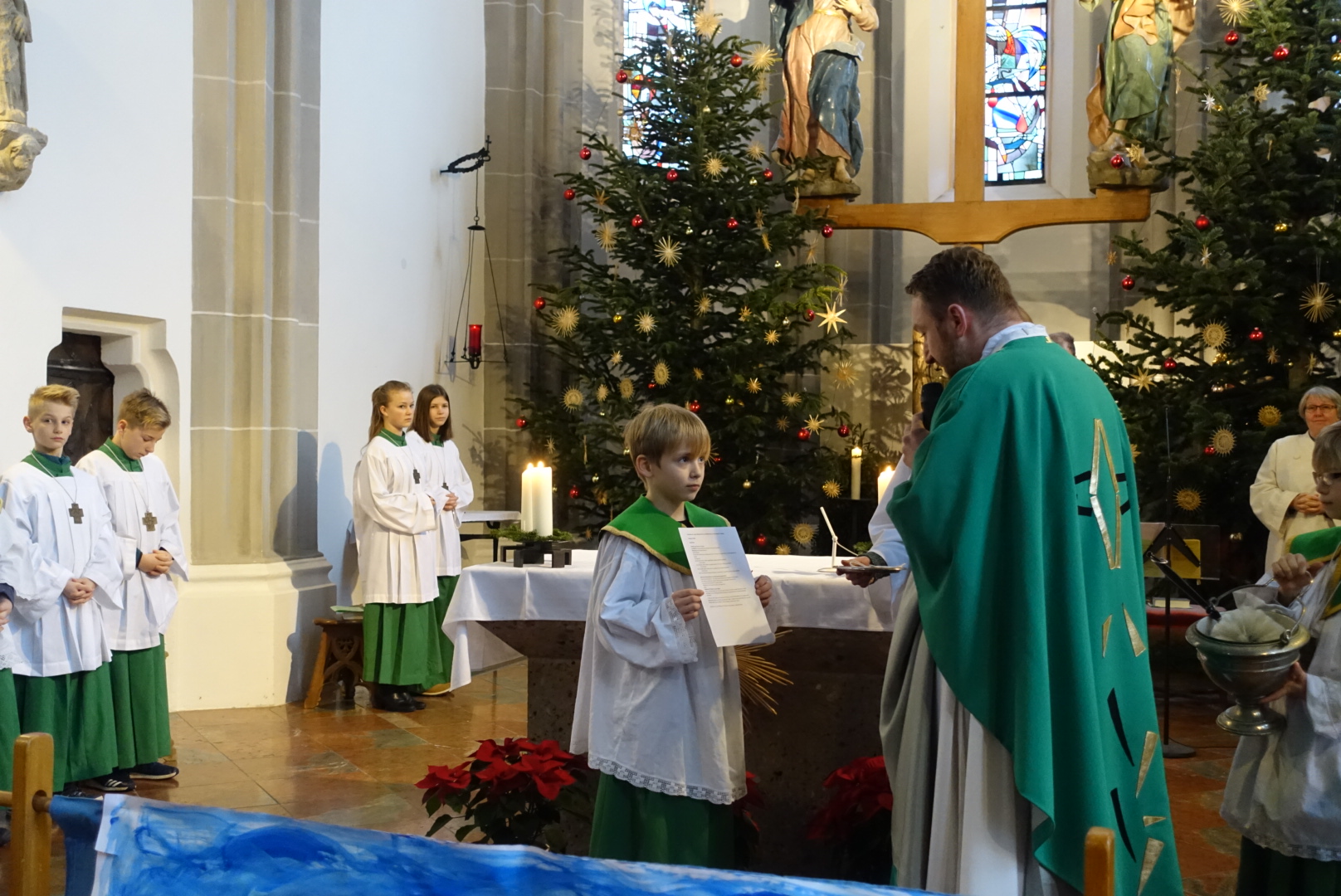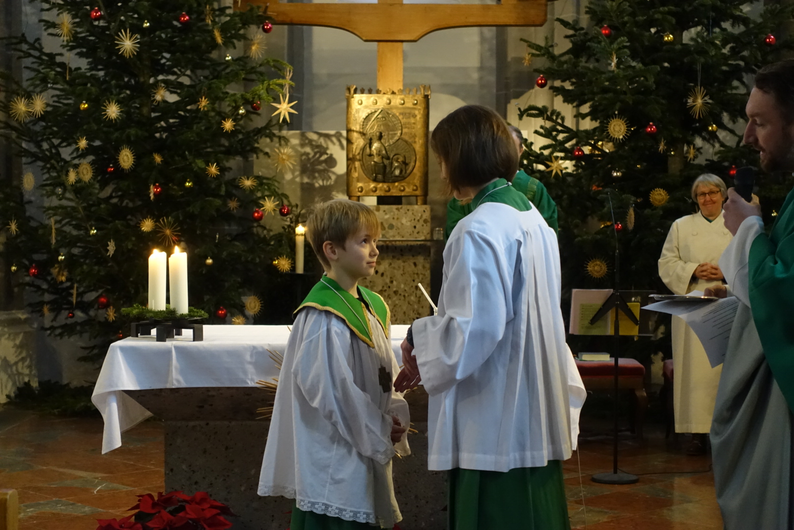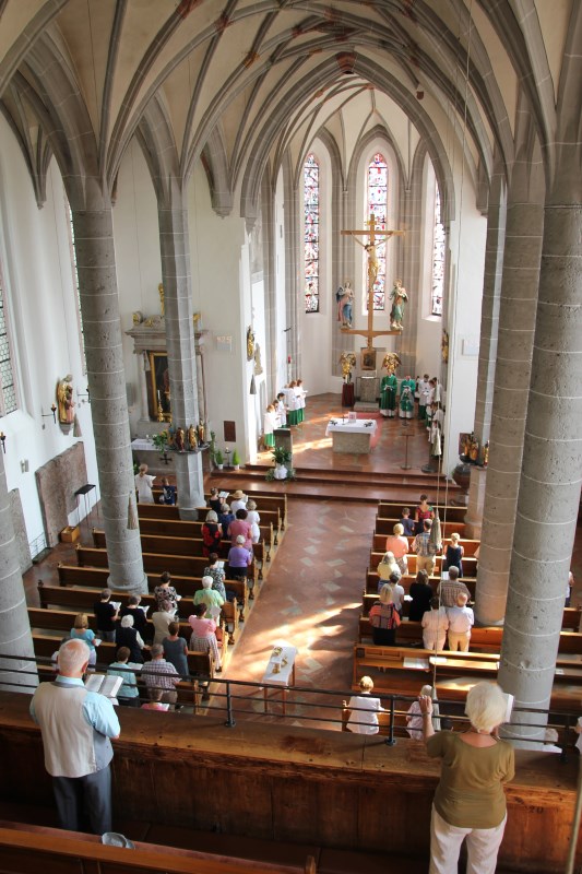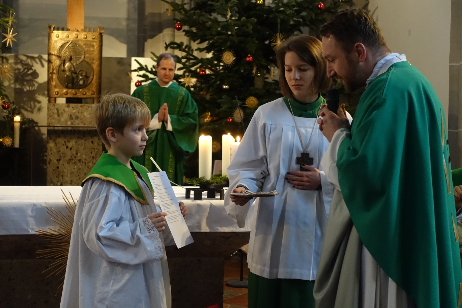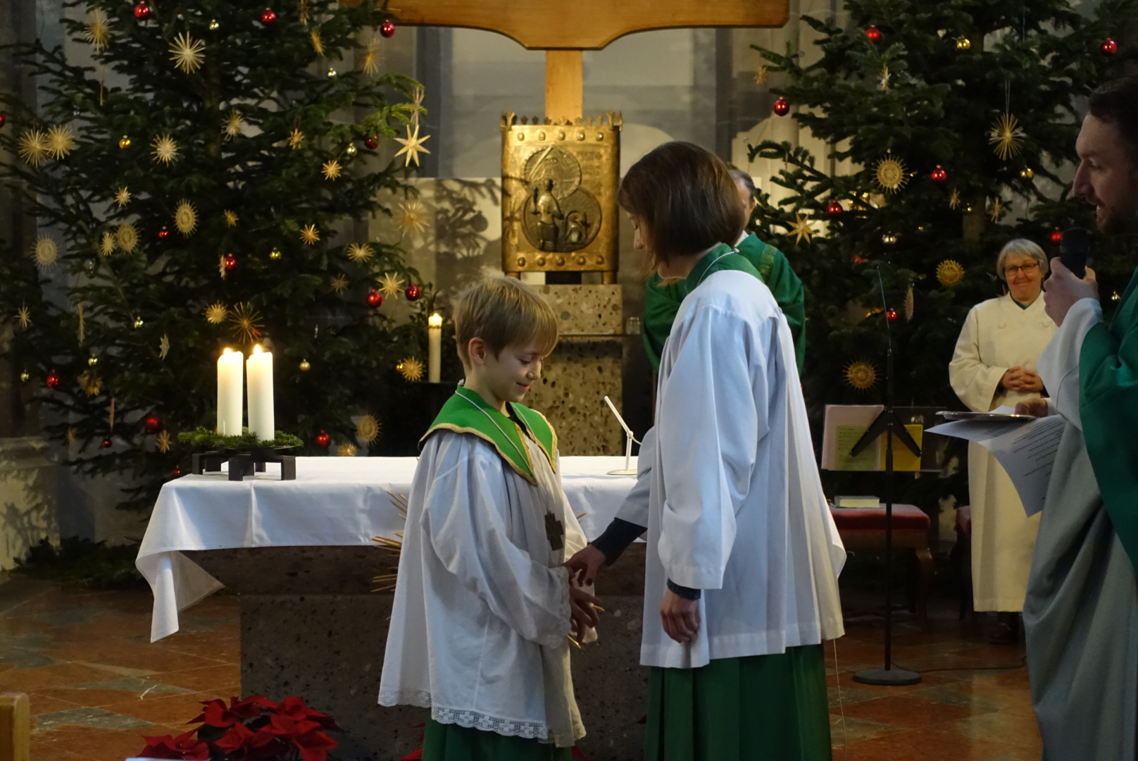 In der Pfarrei St. Andreas hat sich Luisa Jäger (9 Jahre) als einzige der diesjährigen Erstkommunionkinder entschlossen als Ministrantin tätig zu sein. Insgesamt sind 25 Ministranten in der Pfarrei bei den Gottesdiensten durchs Jahr tätig. „Mir gefällt die Arbeit, vor allem weil ich dem Pfarrer während der Messe helfen kann.“ sagt die Neunjährige. Wie das geht mit dem ministrieren, dass zeigt ihr nicht nur ihr Bruder, sondern auch Oberministrant Stefan Herth. Wieviele Kelche bei Festtagen nötig sind, wann man Wein und Wasser in den Kelch gießt, wann man die Glocken bei der Eucharistiefeier schwingt und wann welcher Unterrock dass lernt sie jetzt nach und nach. Pfarrer Dr. Florian Schomers segnete das Kreuz, dass sie künftig als Ministrantin tragen wird und Stefan Herth legte es ihr feierlich um.