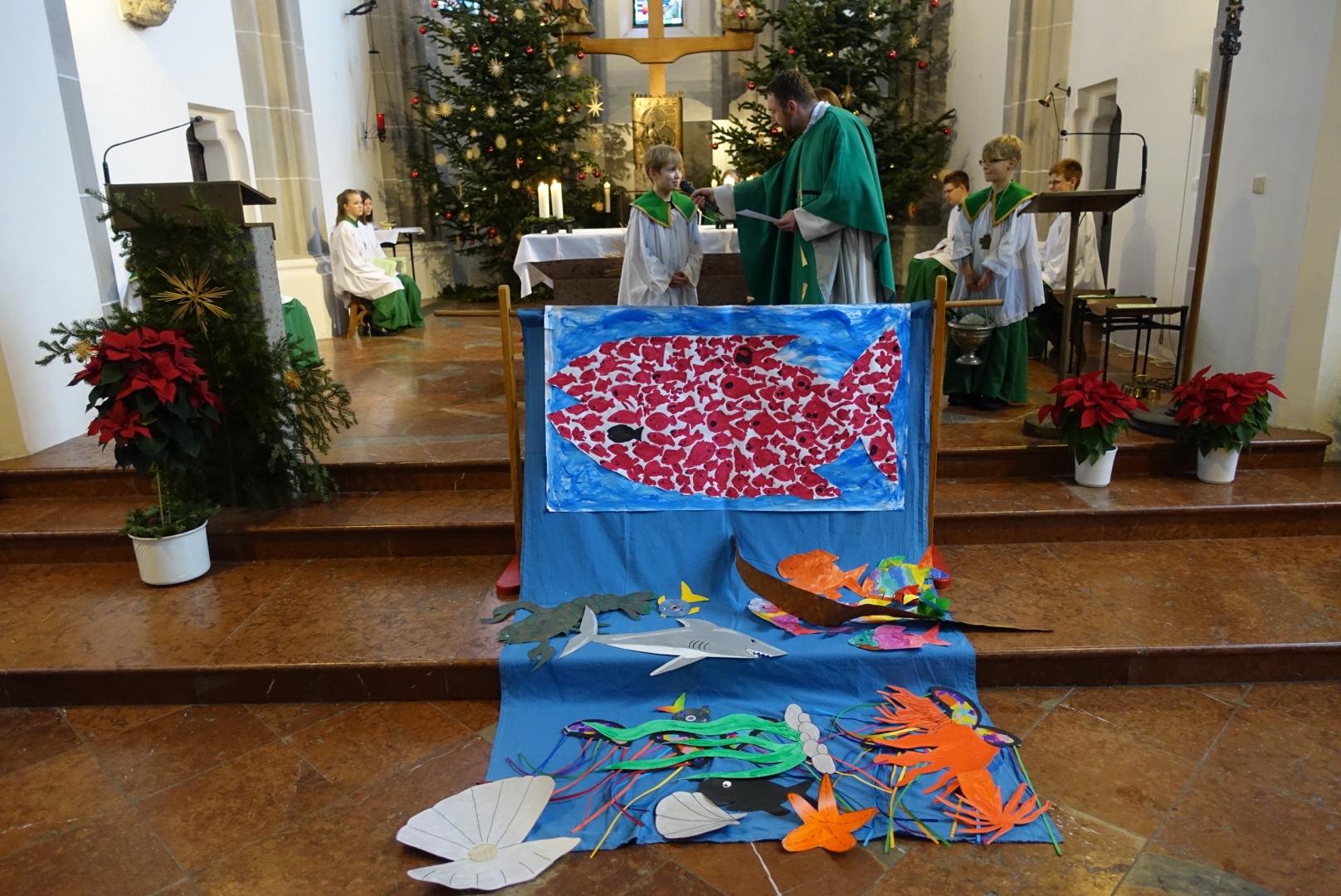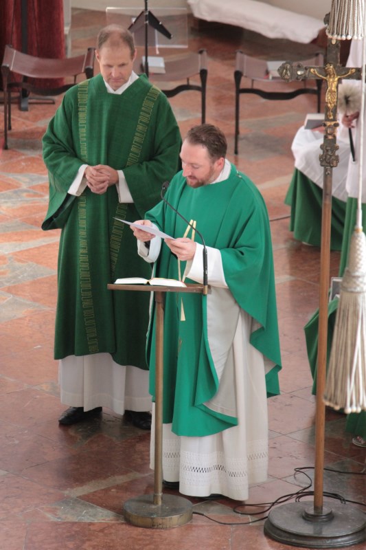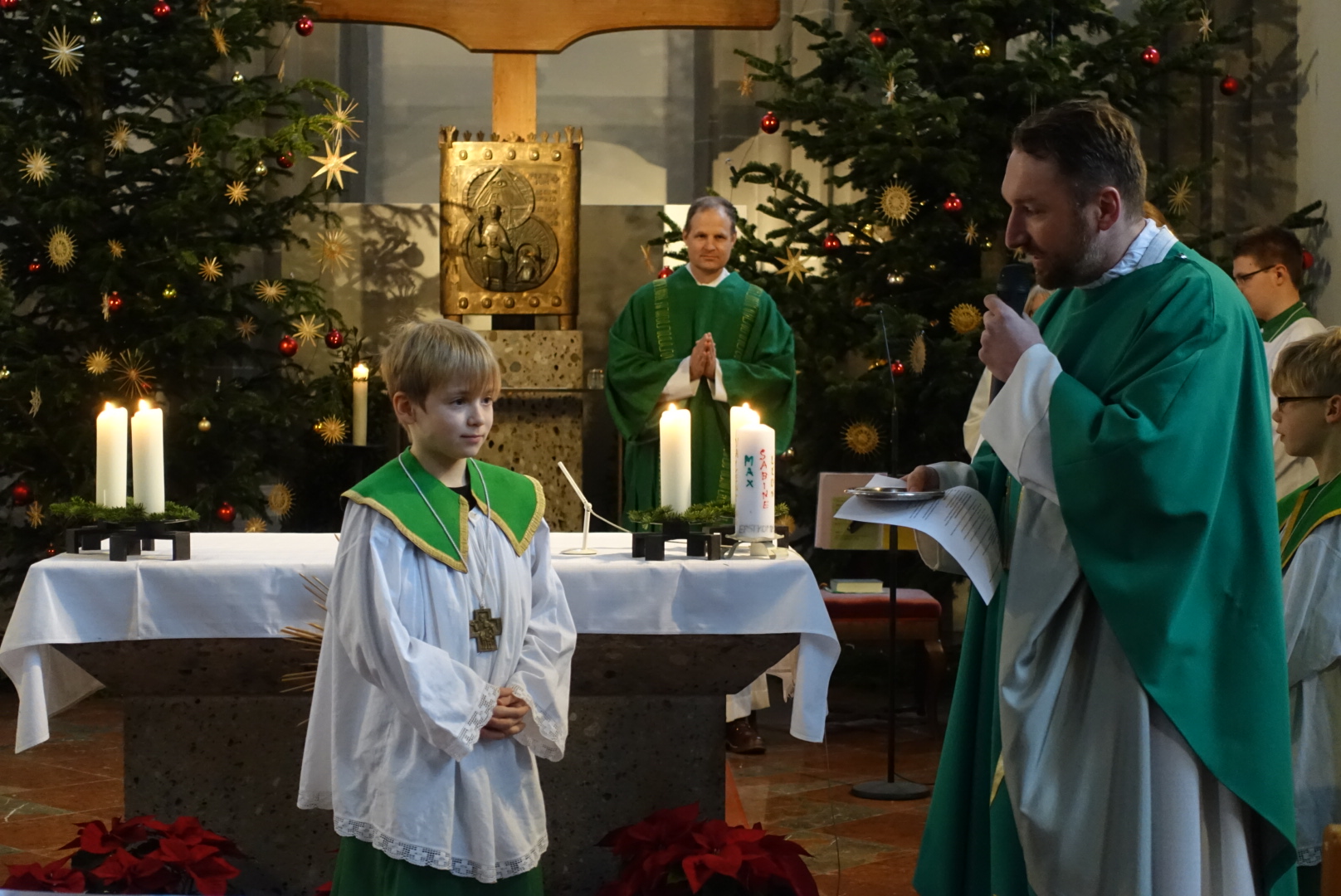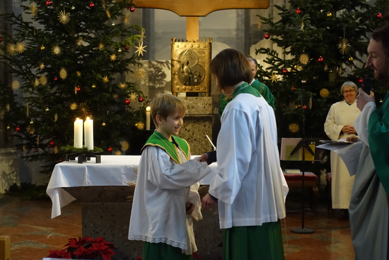 In der Pfarrei St. Andreas hat sich Luisa Jäger (9 Jahre) als einzige der diesjährigen Erstkommunionkinder entschlossen als Ministrantin tätig zu sein. Insgesamt sind 25 Ministranten in der Pfarrei bei den Gottesdiensten durchs Jahr tätig. „Mir gefällt die Arbeit, vor allem weil ich dem Pfarrer während der Messe helfen kann.“ sagt die Neunjährige. Wie das geht mit dem ministrieren, dass zeigt ihr nicht nur ihr Bruder, sondern auch Oberministrant Stefan Herth. Wieviele Kelche bei Festtagen nötig sind, wann man Wein und Wasser in den Kelch gießt, wann man die Glocken bei der Eucharistiefeier schwingt und wann welcher Unterrock dass lernt sie jetzt nach und nach. Pfarrer Dr. Florian Schomers segnete das Kreuz, dass sie künftig als Ministrantin tragen wird und Stefan Herth legte es ihr feierlich um.