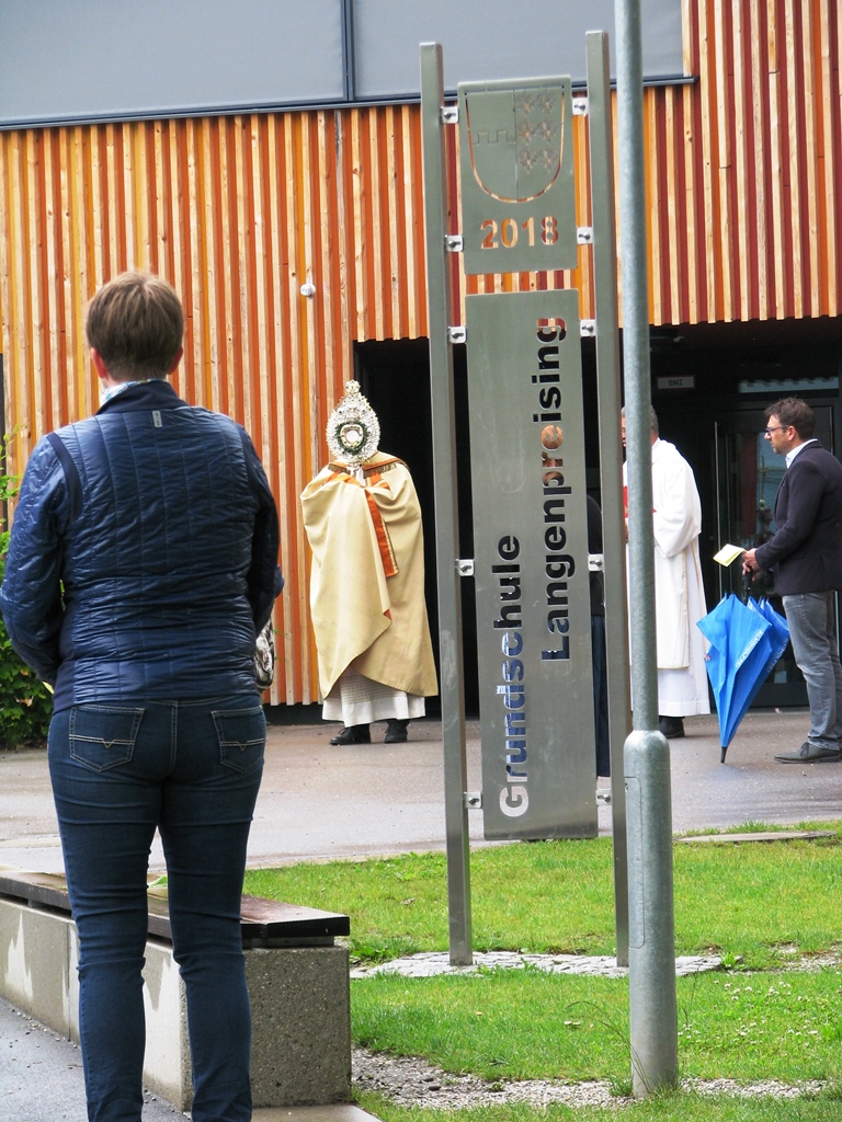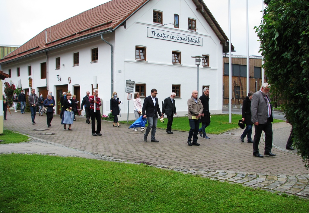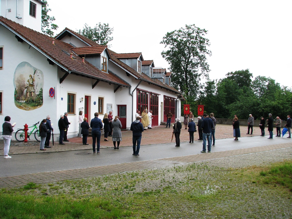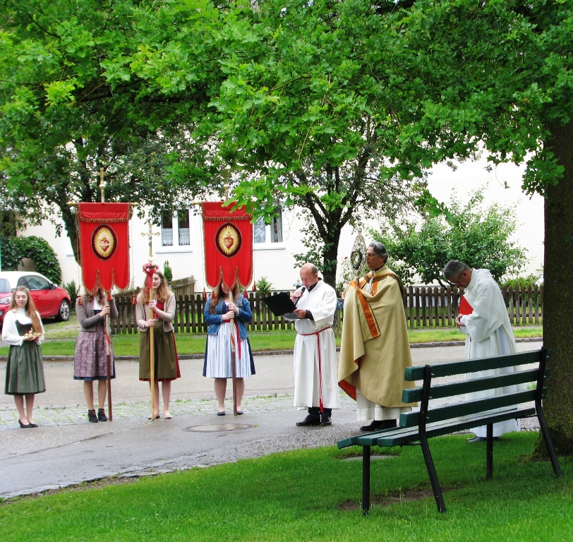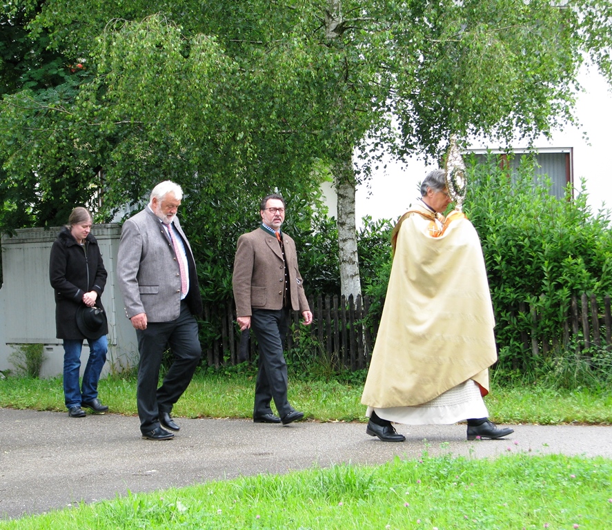 Stellvertretend für alle Bewohner waren wenige, namentlich festgehaltene Personen aus den kirchlichen und gemeindlichen Gremien vor Ort. Unter Glockengeläut wurde das Allerheiligste an Stationen rund um die Pfarrkirche getragen und dort der Segen für die ganze Gemeinde gespendet. In den Fürbitten gedachte man aller Menschen die hier leben und bat um Gottes Schutz und Hilfe für die Nöte in dieser Zeit. Auch unserer Verstorbenen wurde dabei herzlich gedacht. Alle Gläubigen aus dem Pfarrverband waren in den Gedanken und Herzen der Beteiligten präsent.