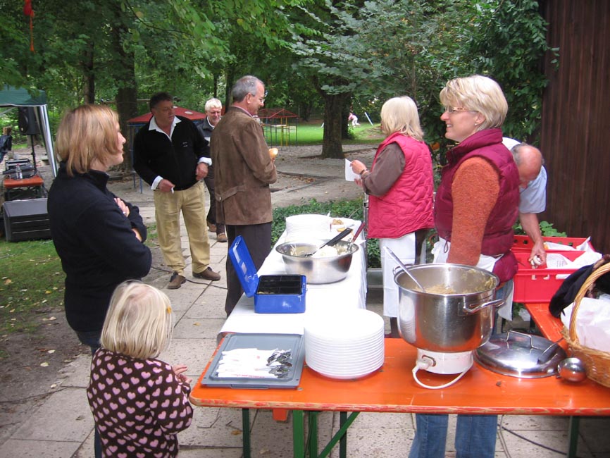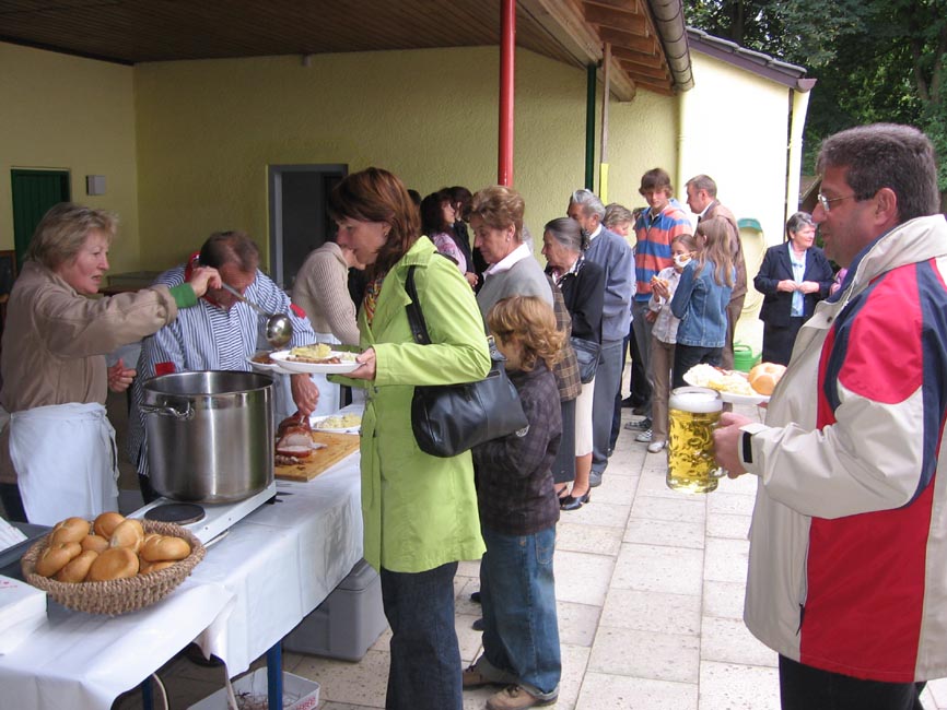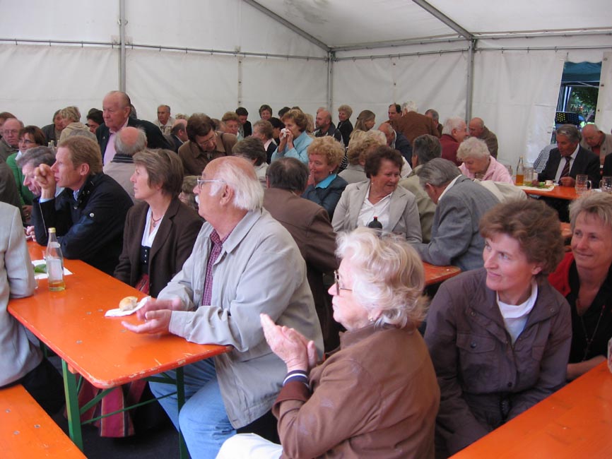 Die Musikanten spielten auf. Die Gäste strömten herbei und suchten schon bald den Schatten unter den blauen Sonnenschirmen. Bratenduft regte den Appetit an und das „Café“ mit den vielen gestifteten leckeren Kuchen lud zum gemütlichen Kaffeestündchen ein.