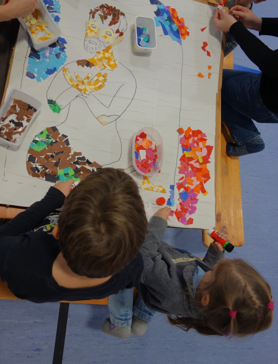Nach den Spielen konnten sie sich auf 6 Stationen verteilen und nach Lust und Laune durchwechseln: Kleine Gänse bemalen und mit Federn bekleben, Laternen basteln, eigene Martinsumhänge gestalten, an dem großen Mosaik-Bettler mitbasteln, Stockbrot am Lagerfeuer rösten und dazu Martinslieder singen und gebackene Gänse mit Zuckerguss und Zuckersträußel dekorieren.