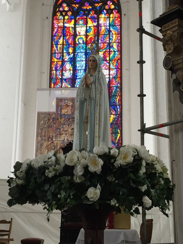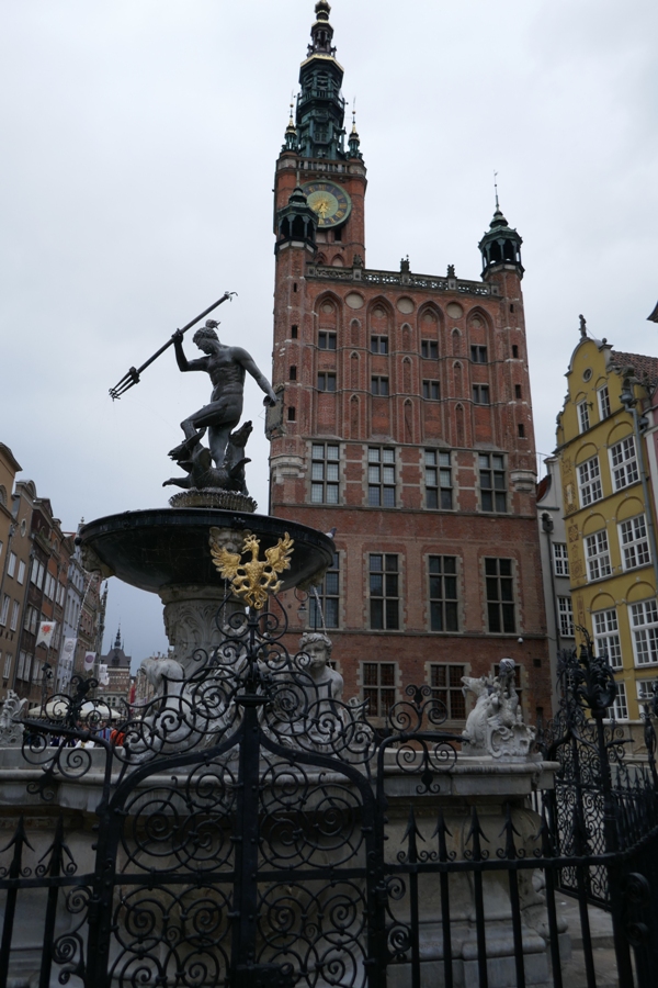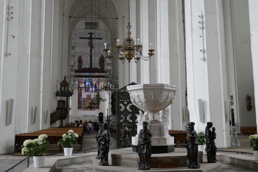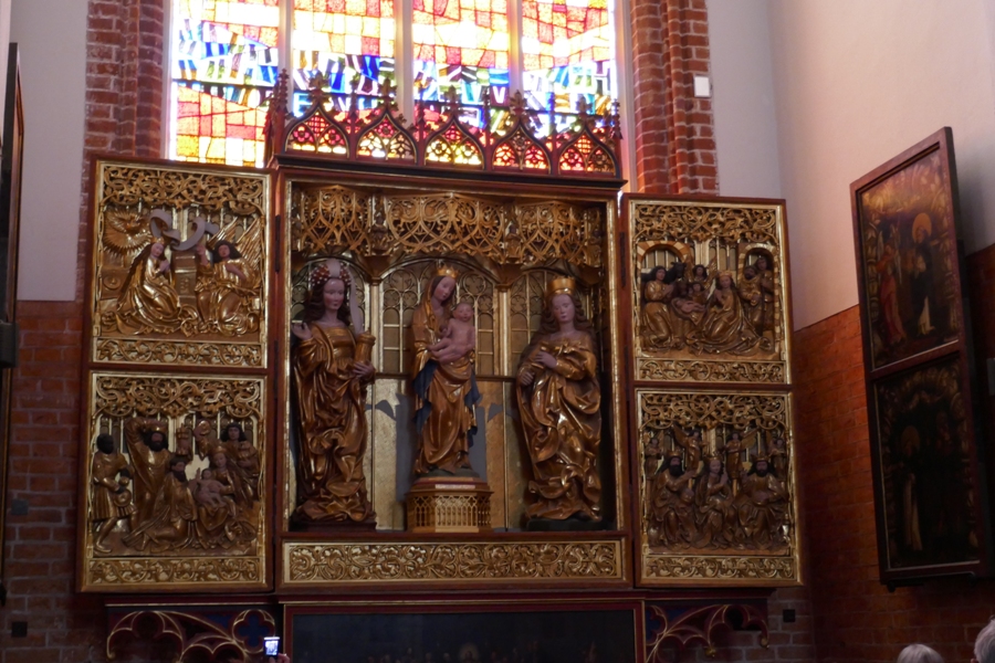 Hinter dem grünen Tor tat sich eine andere Welt auf. Im mittelalterlichen Stadtkern, dem langen Markt, reihten sich schmale Häuser mit beeindruckenden Giebelfassaden und vorgelagerten Terrassen, sogenannten Beischlägen, aneinander. Das Backsteinrathaus mit Turm und Glockenspiel zog den Blick auf sich, davor der Neptunbrunnen, an dem früher die Hinrichtungen stattfanden, und das goldene Haus mit dem Artushof, in dem sich die Ratsherren zu Beratungen trafen. Durch das goldene Tor mit der Inschrift „Es muss wohlergehen die dich lieben, es muss Friede sein inwendig in deinen Mauern und Glück in deinen Palästen“ erblickte man das ehemaligen Gefängnis mit Peinturm, in dem sich jetzt das Bernsteinmuseum befindet. In diesem Umfeld spielte auch die Geschichte des kleinen Oskars aus der „Blechtrommel“ von Günter Grass. Über die Markthalle und den wunderbar bestückten Obstmarkt vorbei kam man zur Marienkirche, der größten Backsteinkirche der Welt, die mit ihren 105 Metern Länge 25.000 Menschen fassen kann. Das gotische Gotteshaus besticht innen mit der Goldenen Madonna und der 12 Meter hohen astronomischen Uhr. Im Seitenchor ehrte die Gruppe die Muttergottes mit dem gesungenen Angelusgebet.