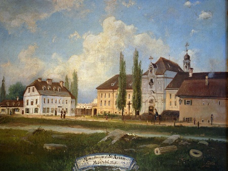 (Bild links: Das St.Anna-Klosters um 1840 nach einem historischen Gemälde im Franziskanerkloster St. Anna)