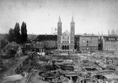 (Bild links: Baugrube der Pfarrkirche St. Anna 1887)