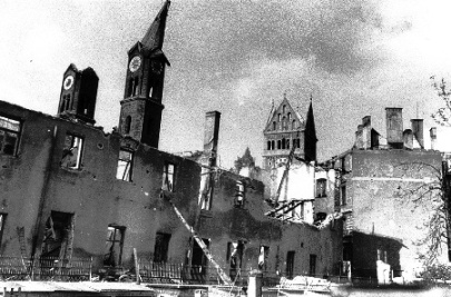 (Bild links: Fotografie der Kriegsschäden nach 1944, im Bild Franziskanerkloster, Klosterkirche, Turm der Pfarrkirche)
