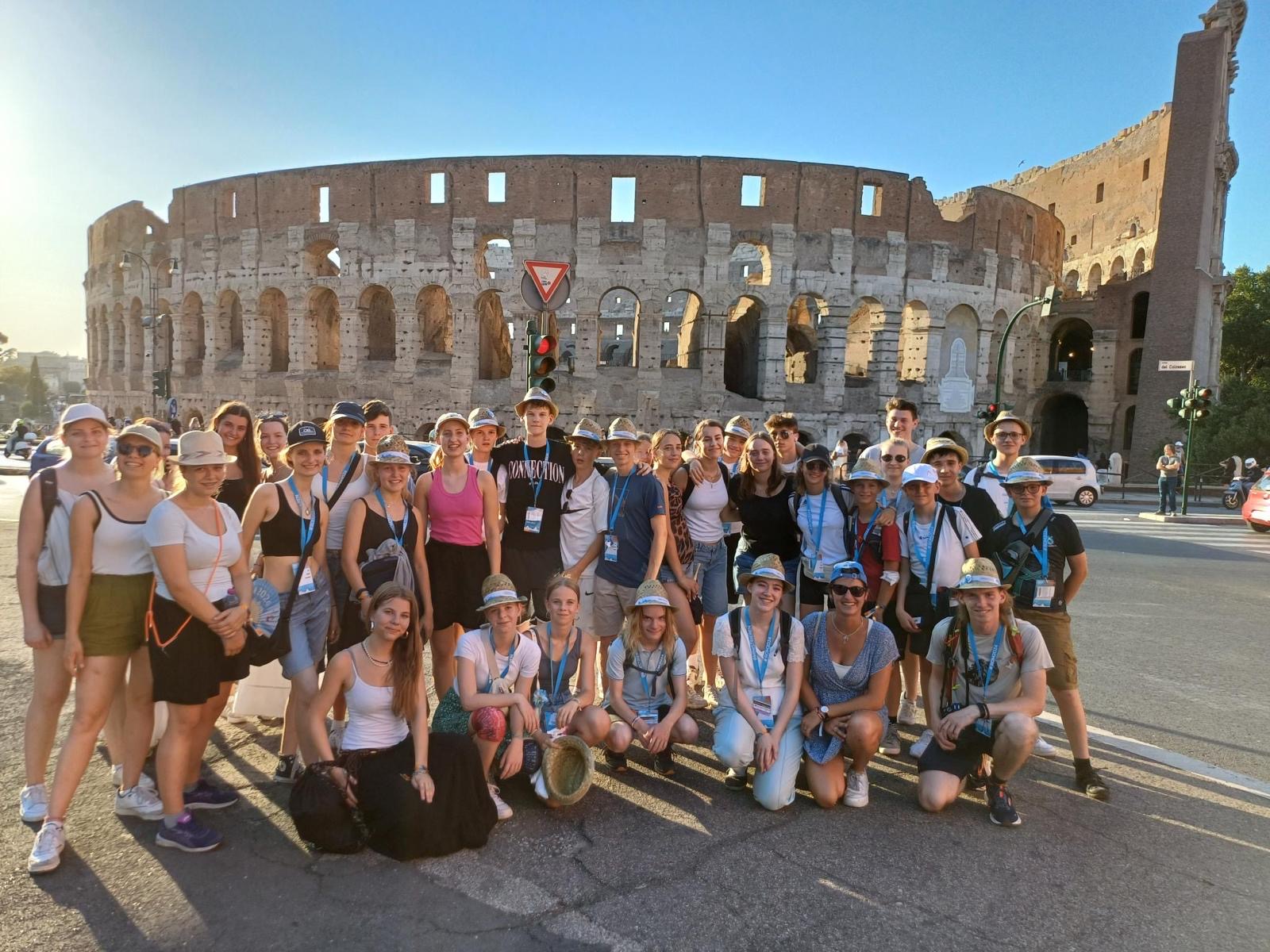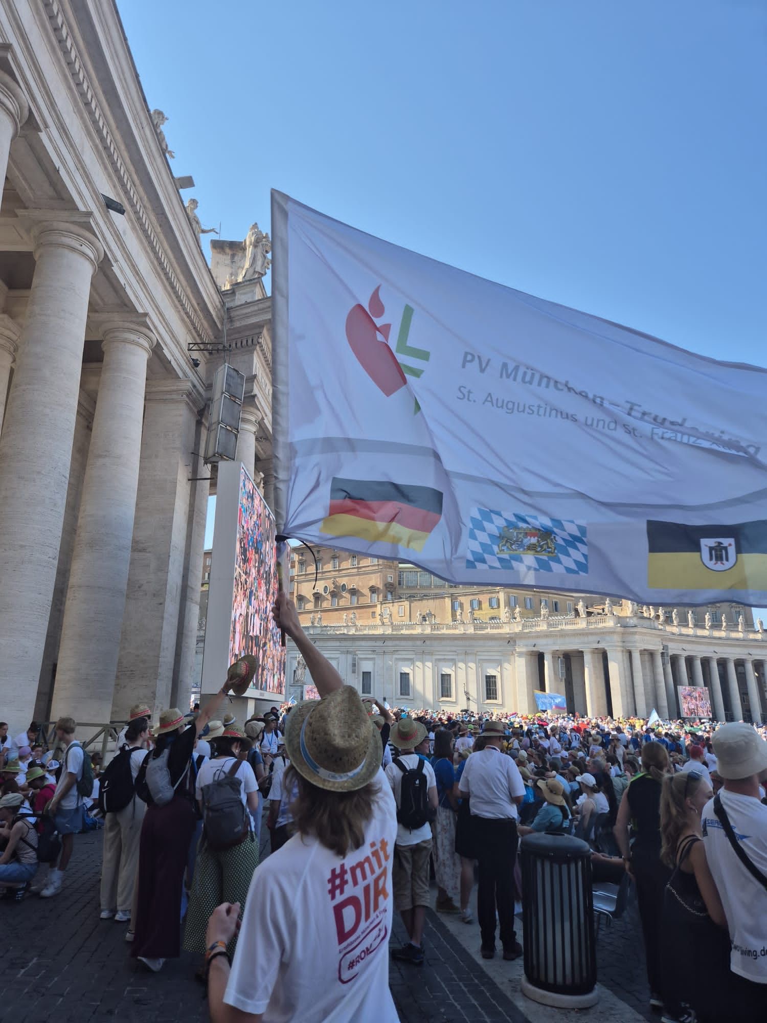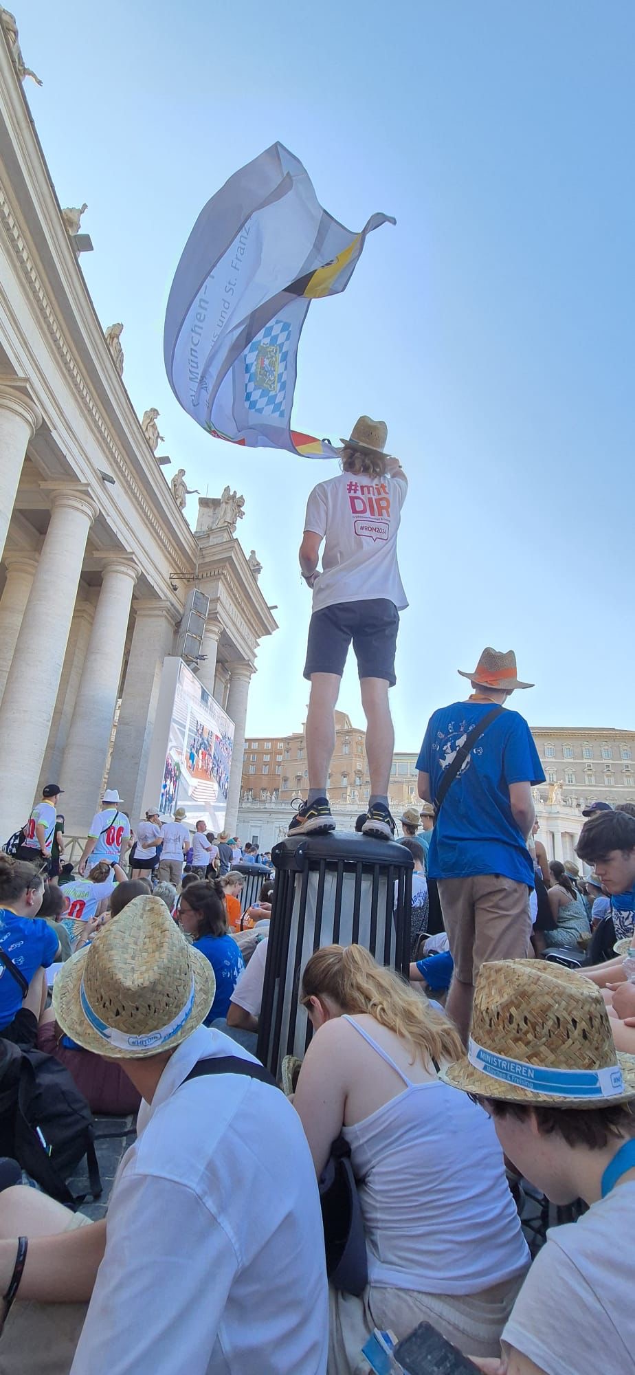 Zur Ministrantenwallfahrt trafen sich in der ersten Augustwoche fast 50.000 Ministrantinnen und Ministranten aus aller Welt, um eine Woche gemeinsam in Rom zu verbringen. Höhepunkt war die Papstaudienz auf dem Petersplatz am 30.07.2024. Auch 51 Minis mit Ihren GruppenleiterInnen aus St. Augustinus, Christi Himmelfahrt und St. Franz Xaver waren dabei.