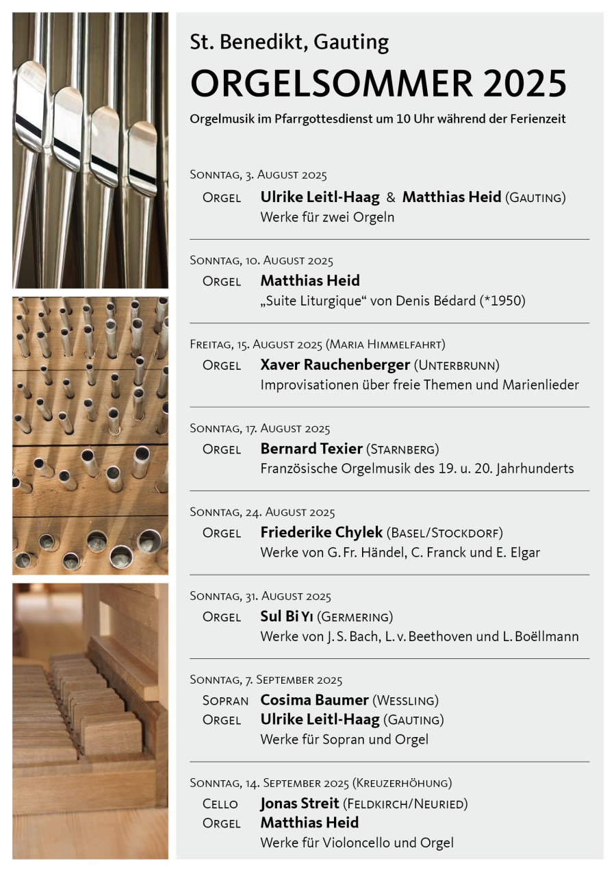 - Sonntag, 7. September 2025: Cosima Baumer (Weßling) & Ulrike Leitl-Haag (Gauting) lassen Werke für Sopran und Orgel erklingen.