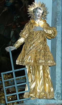 Erzdiakon des Papstes Sixtus II., starb nach der frühen Überlieferung an einem 10. August zusammen mit vier Klerikern den Martertod. Nach der legendarischen dramatischen Leidensgeschichte, die bereits Ambrosius im 4. Jh. bekannt war, wurde Laurentius auf einem Rost zu Tode gebraten. – Unter Konstantin wurde bei seinem Grab im Coemeterium an der Tiburtinischen Straße eine Basilika errichtet. Ebenso fand dort bereits in der 1. Hälfte des 4. Jhs. am 4. August die Festfeier statt. Das Grab des Märtyrers erfreute sich zunehmender Pilgerbesuche. Die Basilika S. Lorenzo fuori le mura gehört zu den sieben Hauptkirchen Roms. Nach dem Sieg über die Ungarn auf dem Lechfeld am 10. August 955 erlebte der Kult in Deutschland eine Hochblüte.