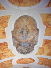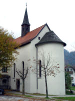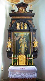 Bemerkenswert ist der Altar mit der Schutzmantel-Madonna und den Heiligenfiguren Stephanus und Laurentius. Der zierliche Renaissance-Tabernakel stammt aus der abgebrochenen Pfarrkirche, wo er auch schon das Allerheiligste barg. 1952 wurde an der Decke ein dezenter Fresken-Zyklus freigelegt, der in 11 Szenen das Marienleben darstellt.