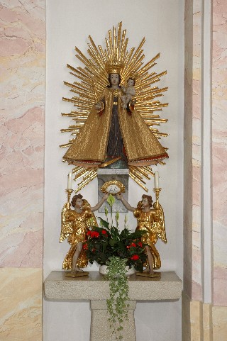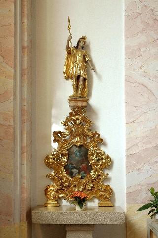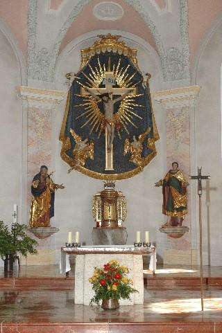 Ebenfalls aus dem alten, abgetragenen Gotteshaus stammen der Tabernakel, die beiden Assistenzfiguren Maria und Johannes sowie zwei Engel, die dem Rokokokreuz im Presbytherium zugeordnet sind.