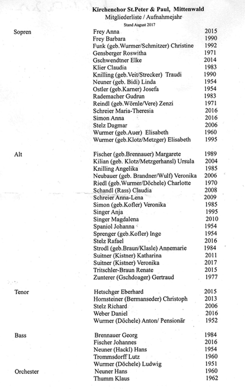 Seit jeher mühen sich Kirchenchor und Orchester um eine Musica Sacra, die zu intensiverer Verkündigung, zum Lob Gottes und zu Glaubensvertiefung führen kann, oder mit den Worten des II. Vatikanischen Konzils ausgedrückt: " Das Heilige besser zum Ausdruck bringt ". Dies trifft natürlich auch für die vielen künstlerisch wertvollen Messkompositionen zu, die in Mittenwald gottlob noch musiziert werden.