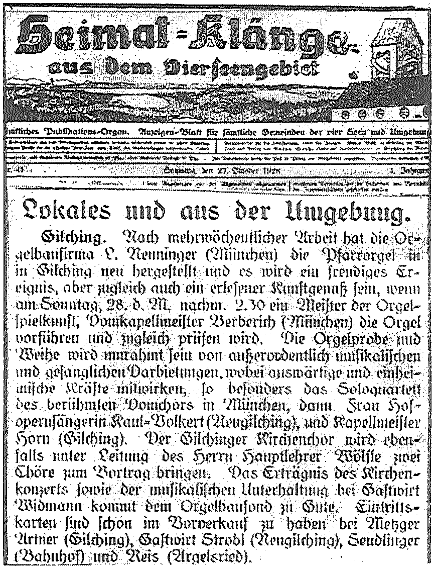musste dringend überholt werden, aber es vergingen 28 Jahre im 20. Jahrhundert, bis die vollständig restaurierte Orgel eingeweiht werden konnte. (Quelle: Bericht der Heimatzeitung „Heimatklänge“ aus dem Vierseengebiet).