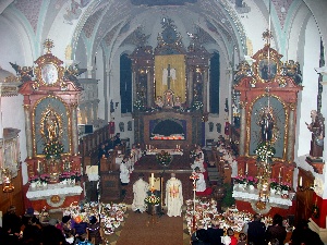 serer Stadtkirche herein, sieben Erinnerungskerzen für unsere Pfarrkirchen mit den Filialen standen dann auf dem Altar, Weihbischof Wolfgang Bischof hielt die Predigt in der vollen St. Georgskirche, überreichte anschließend die Gründungsur-