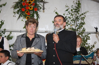 Die PGR-Vorsitzenden bringen als Geschenk ein Messgewand