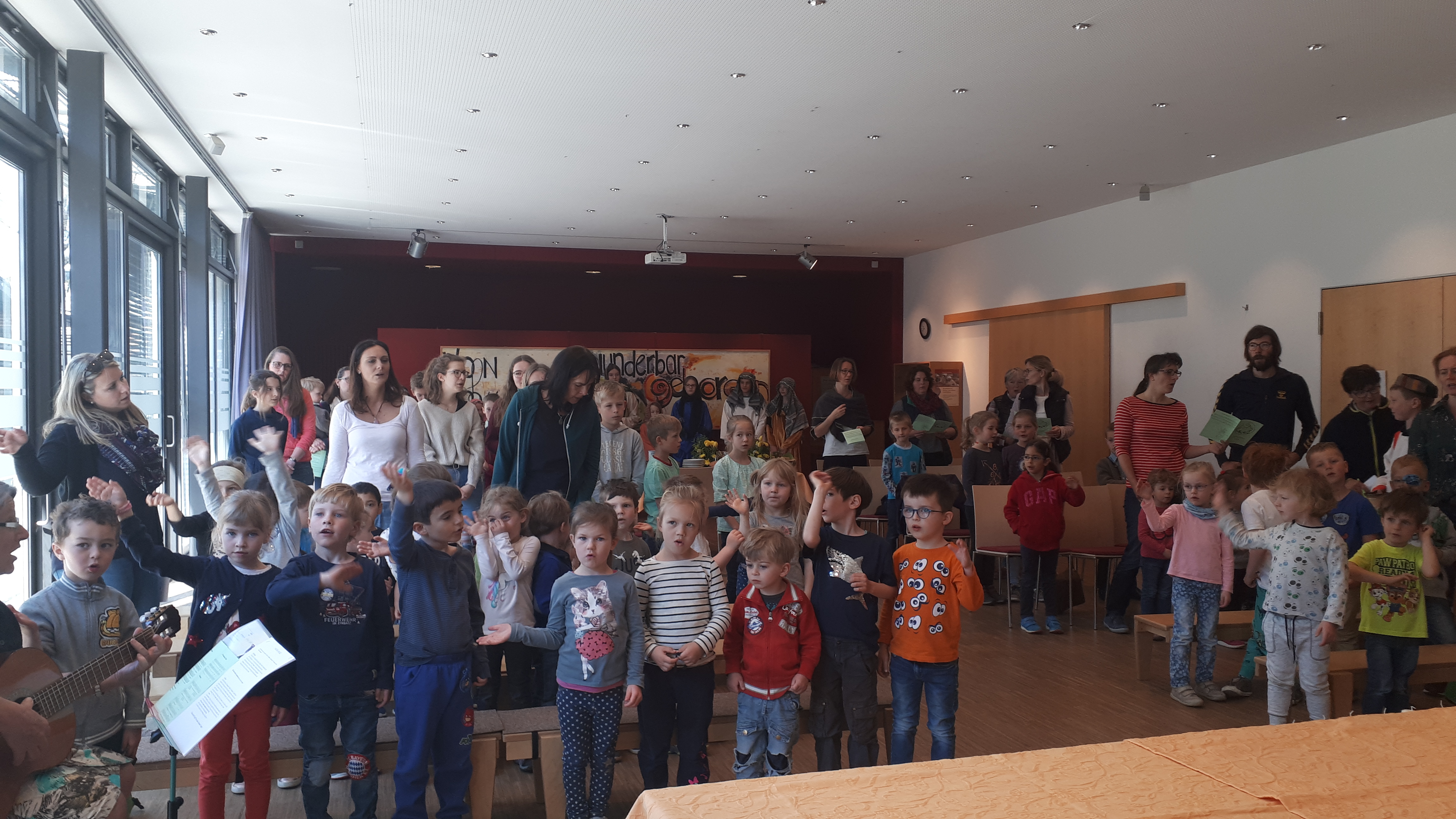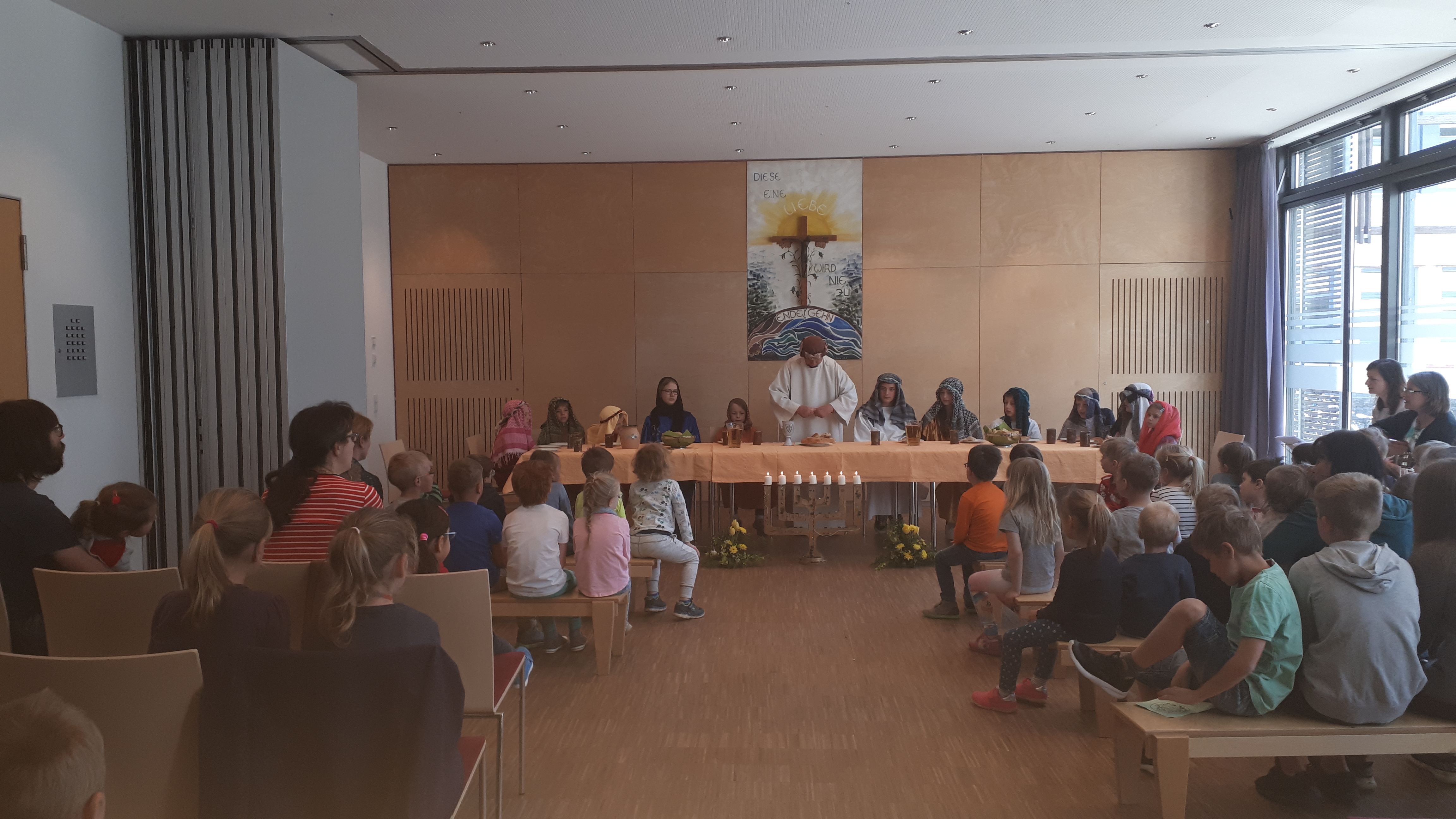 Am Vormittag des Gründonnerstags war der Pfarrsaal St. Georg wieder gut besetzt. Die Kinder unseres Kindergartens mit ihren Betreuerinnen waren gekommen, sowie Ministranten und Jugendliche der Pfarrei, Helferinnen dieser Agapefeier und auch einige Eltern. Gabriele von Reitzenstein und Theresa Rhee führten durch diese kindgerechte Abendmahlfeier, in der Jesus mit seinen 12 Jüngern vor seinem Leiden und Sterben das Abschiedsmahl mit Brot und Wein feierte. Gemeinsames Singen, Hören und Beten - aber auch Essen und Trinken - bereiteten viel Freude.