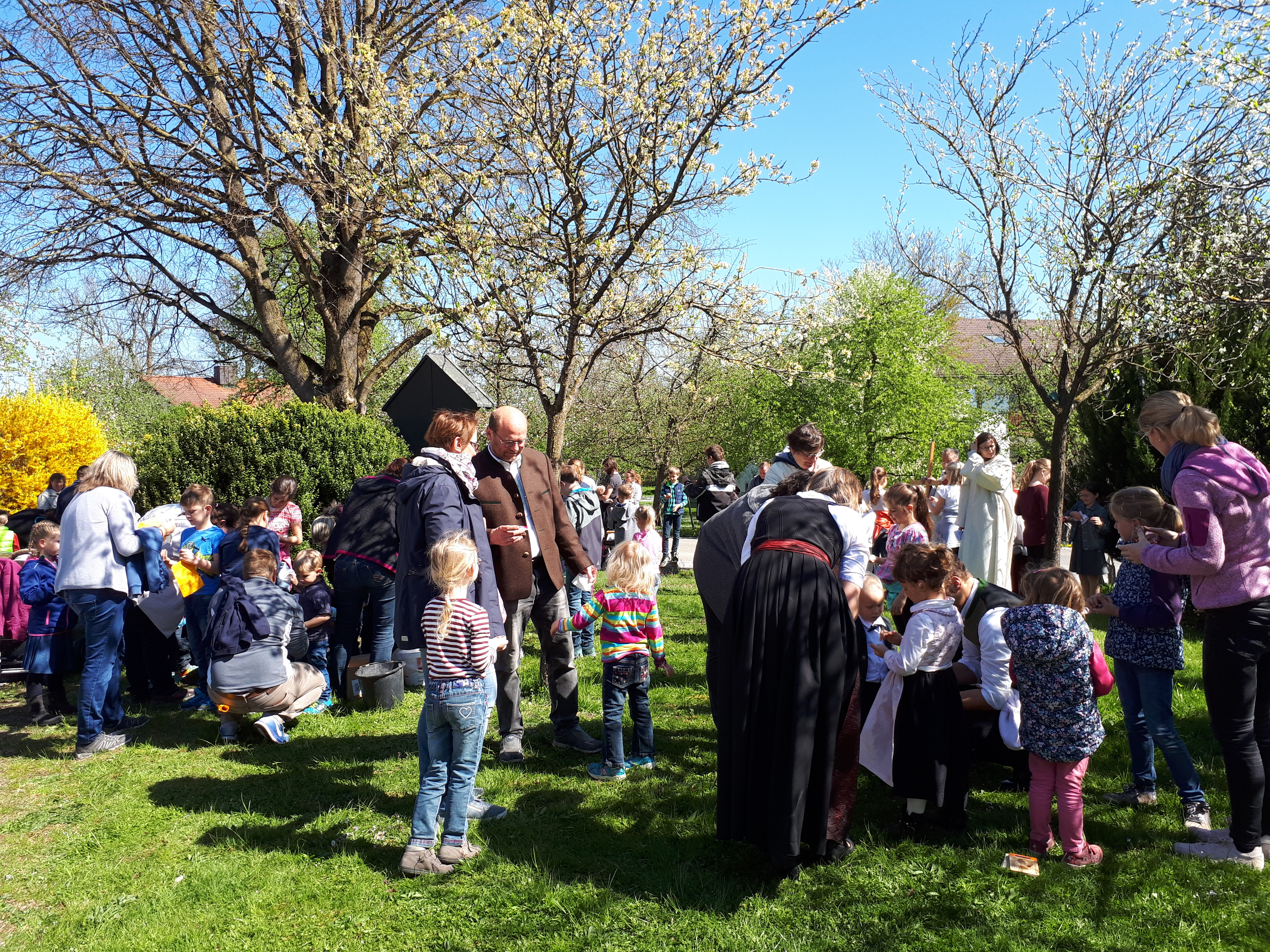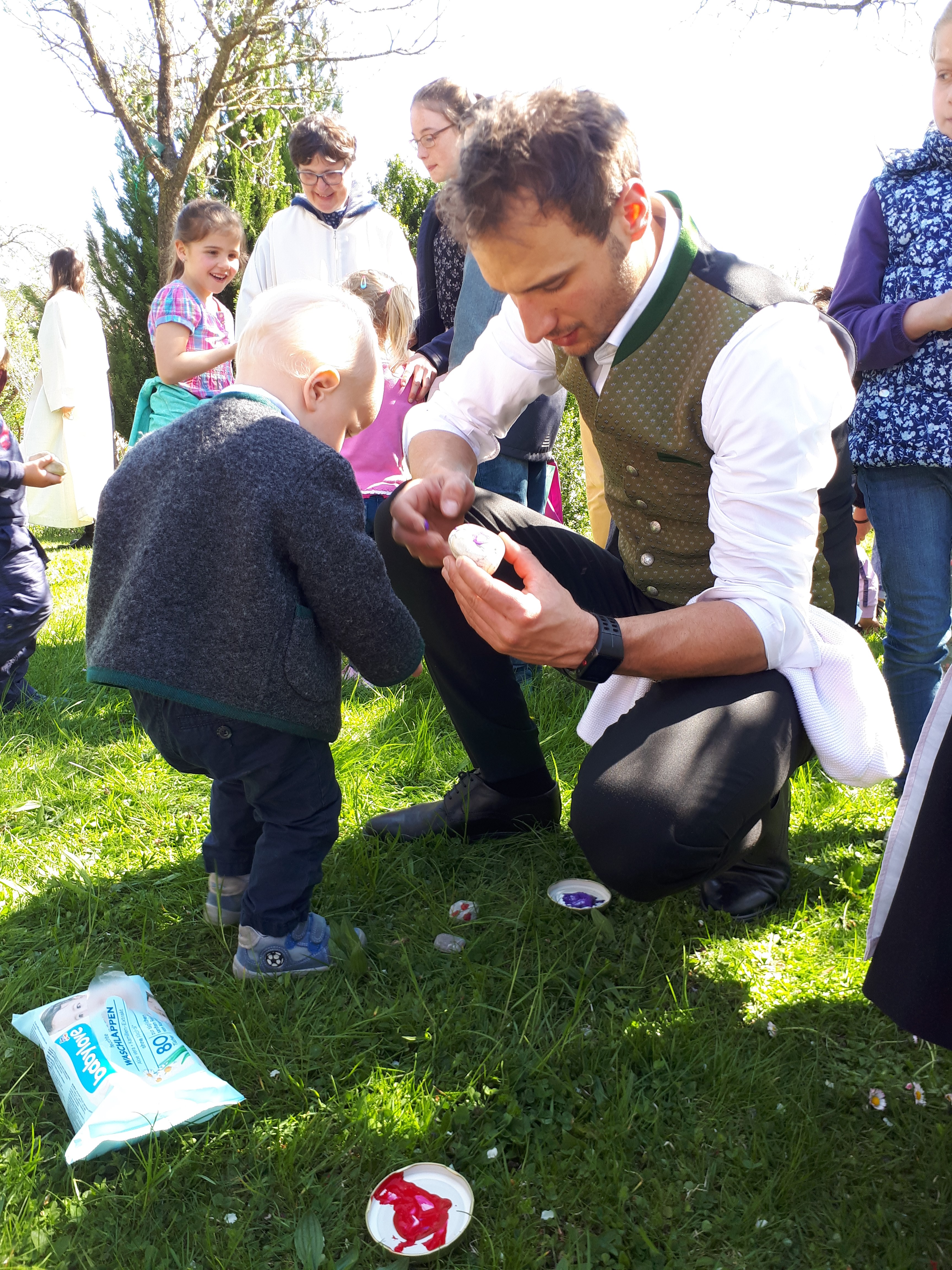 kirche am Osterfeuer versammelt. Kaplan Banda eröffnete die Liturgie mit der Segnung des Feuers und der Bereitung der Osterkerze. Unter dem Ruf "Christus, das Licht" trug der Diakon die Osterkerze in die dunkle Kirche, ihr Licht wurde dann von den Ministranten verteilt. Es folgte das Osterlob - Exsultet - gesungen vom Diakon. Im Wortgottesdienstteil hörten wir vier Lesungen. Nach der Epistel stimmten wir das österliche Halleluja an, es folgte das Evangelium mit der Botschaft vom leeren Grab. Nach der Predigt von Baltaraju schloss sich die Erneuerung des Taufversprechens an. Es folgte dann die festliche Eucharistiefeier mit Kommunion an. Am Ende des Gottesdienstes baten wir um Gottes Segen für die mitgebrachten und festlich geschmückten Osterkörbchen. Nach dem Familiengottesdienst war wieder gegen 11.30 Uhr das Ostereiersuchen für die kleinen und ganz großen Kinder im Pfarrgarten angesagt. Nichts blieb danach übrig!