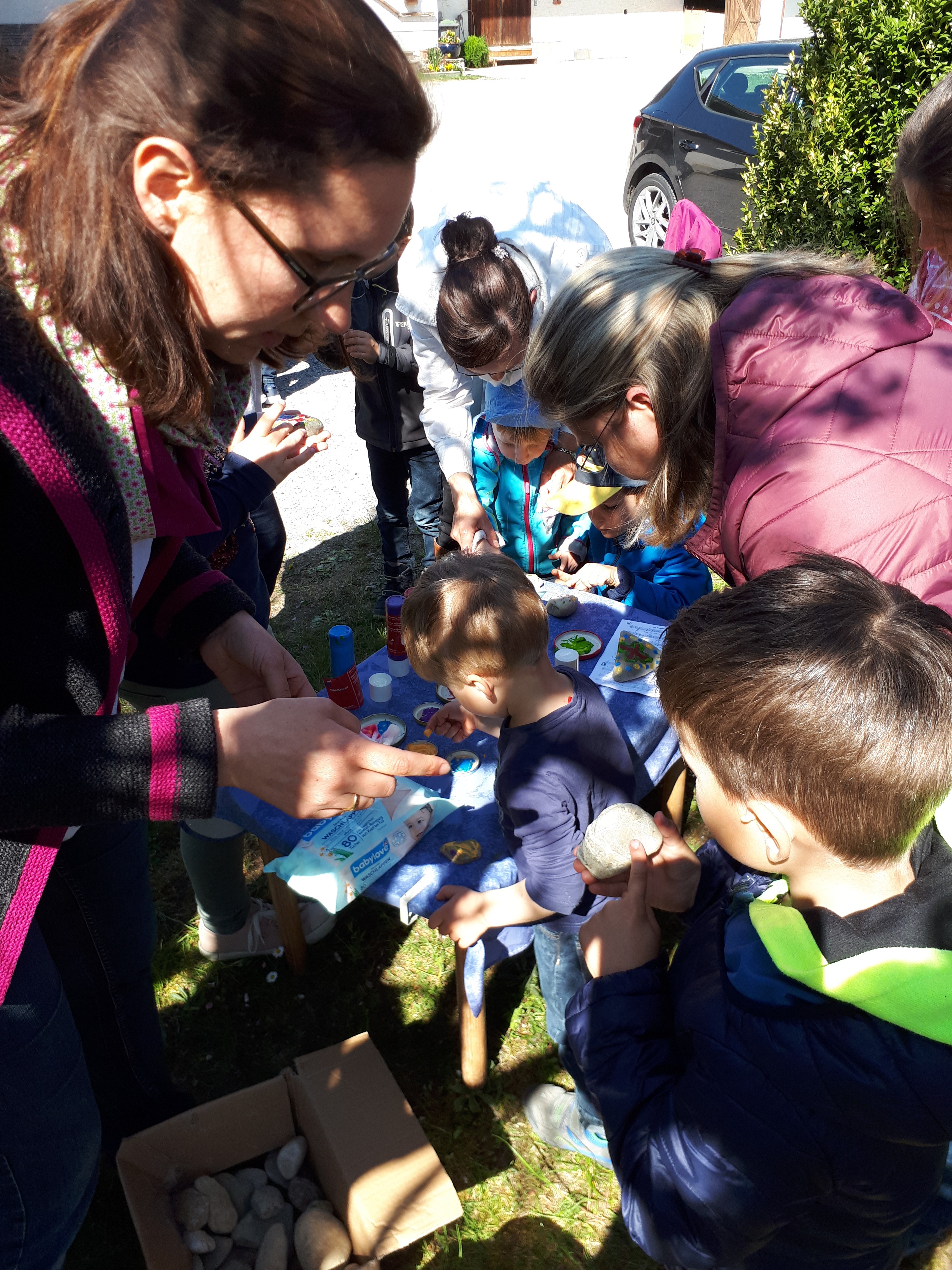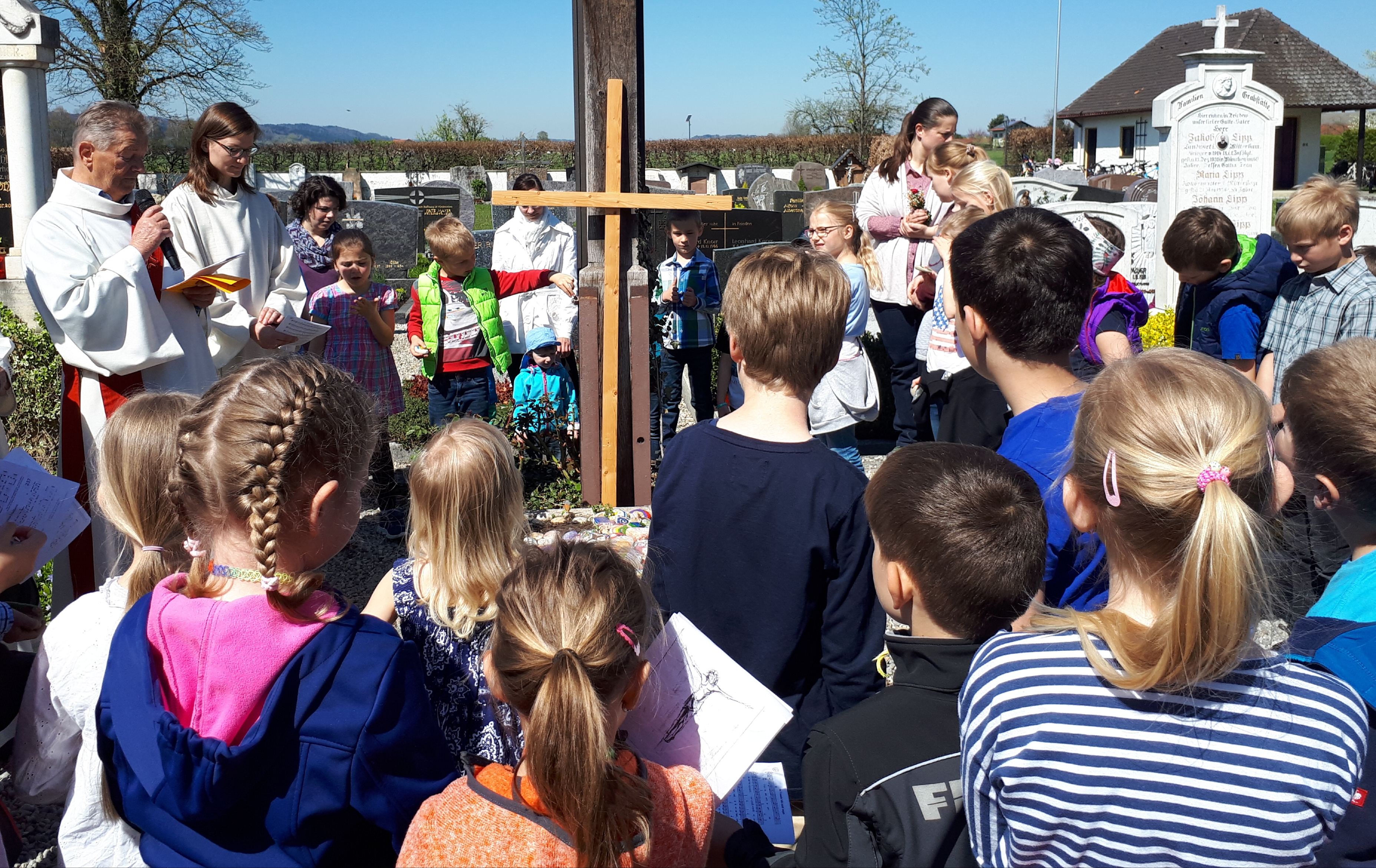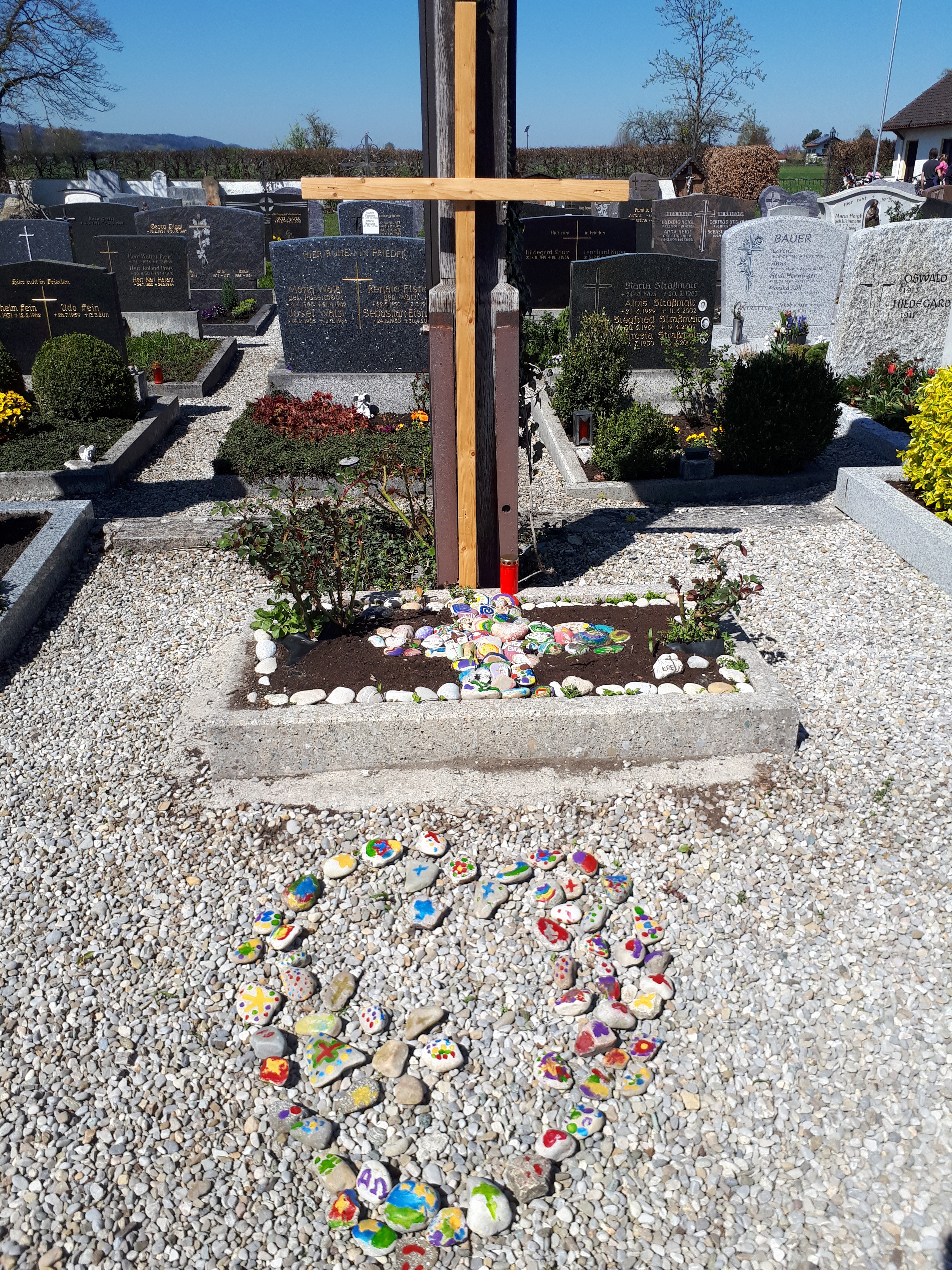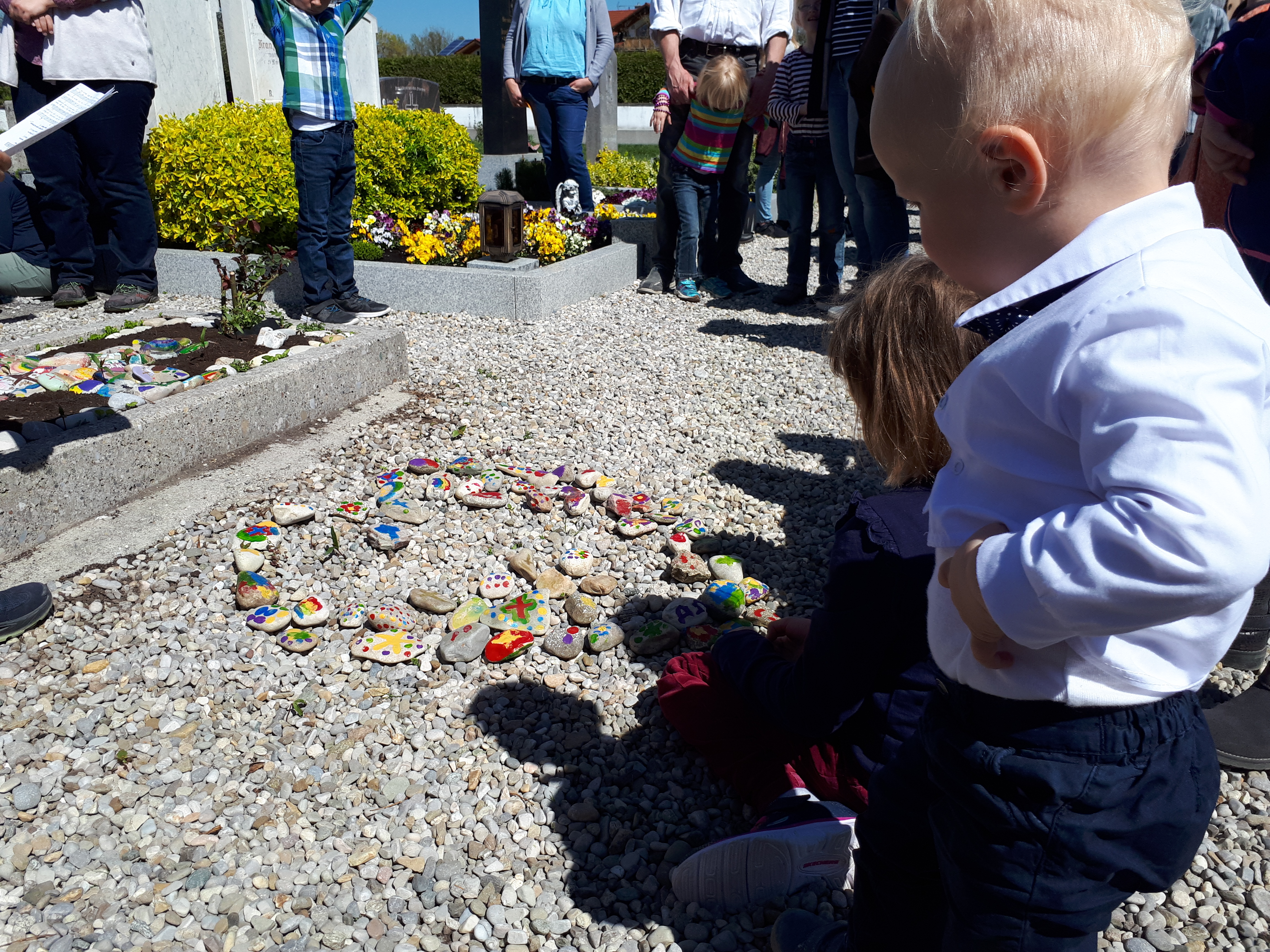 Am Karfreitag Vormittag trafen sich viele Kinder, Eltern und Großeltern m Friedhofsausgang zum Kinderkreuzweg. Er hat ja schon eine lange und gute Tradition in St. Jakobus. In fünf Kreuzwegstationen (1. Jesus nimmt sein Kreuz an am Kindergarten; 2. Jesus begegnet seiner Mutter am Reimeierkreuz; 3. Simon hilft Jesus das Kreuztragen; 4. Jesus stirbt am Friedhofskreuz; 5. Jesus wird ins Grab gelegt vor dem Hl. Grab in der Kirche) wurden kindegerecht Teile der Passion Jesu erzählt, es wurde gebetet und gesungen. Dabei wurde die besuchten Kreuze geschmückt und davor ein Grablicht entzündet. An der dritten Station konnten alle Kinder ausgeteilte Steine mit Fingerfarben bearbeiten und mittragen. Diese wurden dann vor dem Friedhofskreuz als großes Herz auf den Boden gelegt. Auf dem Weg trugen Kinder abwechselnd ein großes Kreuz mit, dazu sangen wir: "Gottes Kraft geht alle Wege mit, alle Wege geht Gott mit!" Begleitet wurden die Kinder von Gabriele von Reitzenstein, Therese Rhee und Bernd Schmitz, sowie Instrumentalisten und dem örtlichen Kinderchor.